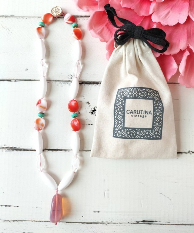 パリを訪れる度に心惹かれて買い付けた、 貴重なヴィンテージビーズを使用したネックレスです。 長い年月を経て大切に保管されていたビーズたち。 甘いミルキーピンクのガラスストーンが目を引くトップ。 果実のようなコーラルレッドとスノーホワイトの バイカラーが美しく、 お顔周りを明るく彩ります。 どこか懐かしいノスタルジーを漂わせるビーズは、 身につけるだけで明るく、ポジティブな印象に♡ 可愛らしさだけでなく、 大人の女性にも楽しんでいただける上品な逸品です。 数量限定のため、希少価値も魅力の一つ。 時を超えたビーズのストーリーと共に、 あなたの日常に彩りと華やかさを添えてくれますように♡ 商品詳細 【サイズ】 長さ 約50cm ガラスストーン 約30mm 【ヴィンテージビーズ】 フランスで買い付けた30年以上の時を経た ヴィンテージビーズを使用しています。 【オールノットの技法】 一粒ずつのビーズを2本の糸で丁寧に結ぶ、 真珠のネックレスにも用いられる技法で製作しています。 丈夫で長くご愛用いただける事はもちろん、 糸ならではのしなやかな動きが生み出す、美しいラインにこだわりました。 ワイヤーでは表現できない、柔らかで女性らしいシルエットが魅力です。 折り目がつかず絡まりにくいため、 付属の巾着に入れて旅先でも気軽にお持ちいただけます。 【金具を使わないこだわり】 デリケートな首元に金具を使いたくない、 金具が劣化するとつい使わなくなってしまう、 これは、私自身が日頃感じていることです。 そこで、留め金具の代わりにフランス製小花柄のボタンを使用しています。 ボタンもデザインの一部として取り入れ、 後ろ姿にさりげないアクセントを添えています。 【ギフトラッピング無料】 この作品を手に取っていただくすべての方に、 特別なひとときをお届けしたいという想いから、 丁寧に仕上げたギフトラッピングを無料で承っております。 ネックレスにはオリジナルの巾着付です。 【ご用途に合わせた選べるカード】 ☑︎ありがとう thank you (ご指定がなければこちらになります) ☑︎お誕生日 Happy Birthday ☑︎クリスマス Merry Christmas ☑︎母の日 Happy Mother's day 【手渡し用のお手さげ】 オプション(有料)からお選びください。 【画像について】 年代物ビーズの繊細な色合いや質感を活かして自然光で撮影しておりますが、 ご覧になる環境やデバイスの特性により、画像と実物の印象が異なる場合がございます。 また、全て手作業のための全体の仕上がりに1cm程度の誤差が生じる場合があります。 【お修理について】 長くご愛用いただく為に 万が一不具合が生じた場合でも安心です。 ・無料修理 商品到着後1週間以内であれば、 製作過程における不具合による破損は無料で対応させて頂きます。 例:パーツの接着不良、金具の破損など ・有料修理 お客様のご使用による破損(例えば、強い衝撃を与えてしまったなど)や、 経年劣化による破損の場合は、有料での修理対応が可能です。 修理にかかる費用は、破損の状況によって異なりますので、お気軽にお問い合わせ下さい。 大切なアクセサリーだからこそ、長くご愛用頂きたいと考えております。 アフターケアもご満足頂けますよう丁寧に対応させて頂きます。 ご不明な点やご質問がございましたら お気軽にお問い合わせ下さい♪ #カルティナ #carutina #アンティークアクセサリー #ヴィンテージアクセサリー #レトロファッション #大ぶりネックレス #古着女子 #アレルギー対応