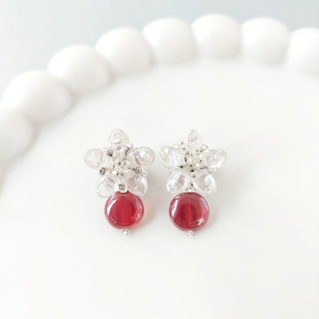 【フランス買付❣️】アンティーク深紅のビーズとヴィンテージのクリアホワイトが花咲くガーベラ イヤリング/ピアス アレルギー対応♡プレゼントにもおすすめ・ギフトボックス無料♡