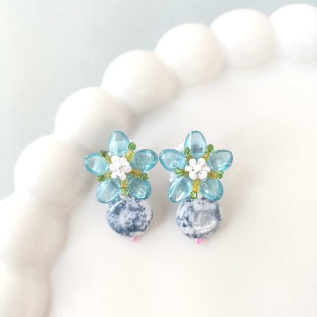 レトロ可愛い 夏空クリアブルーとマーブルの小花 痛くないイヤリング/ピアス【希少 パリ買付ヴィンテージ&アンティークビーズ】アレルギー対応 プレゼントにもおすすめ ギフトボックス無料