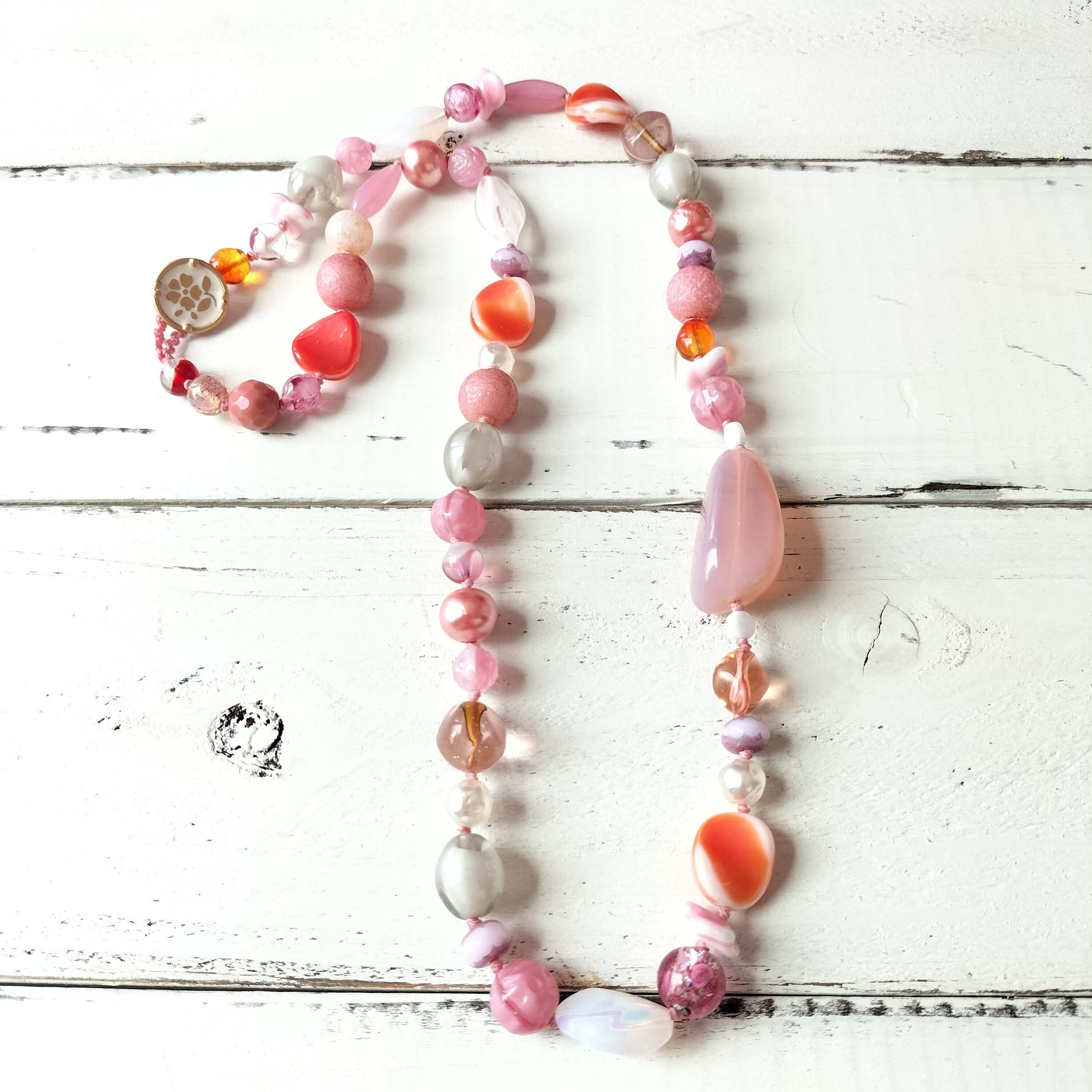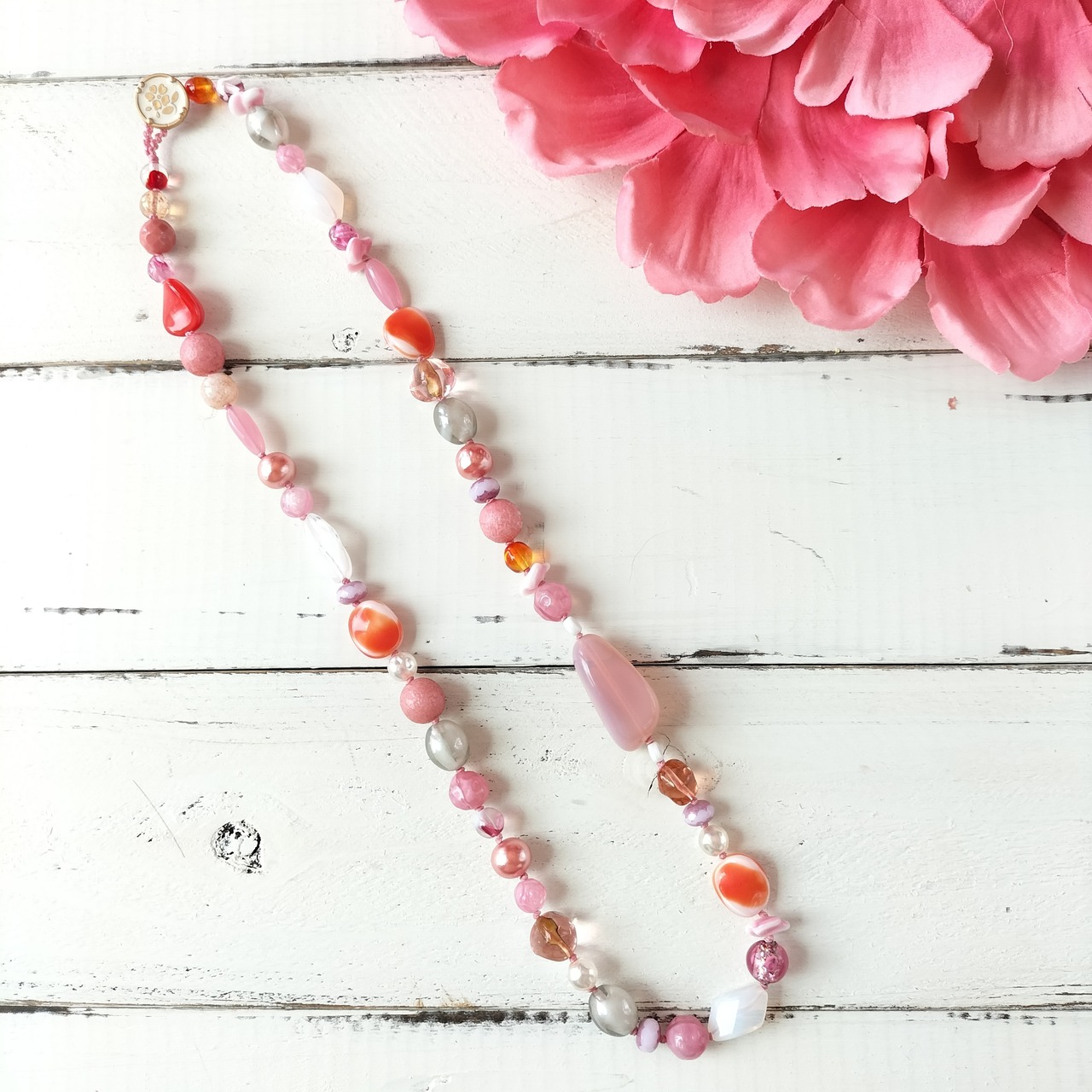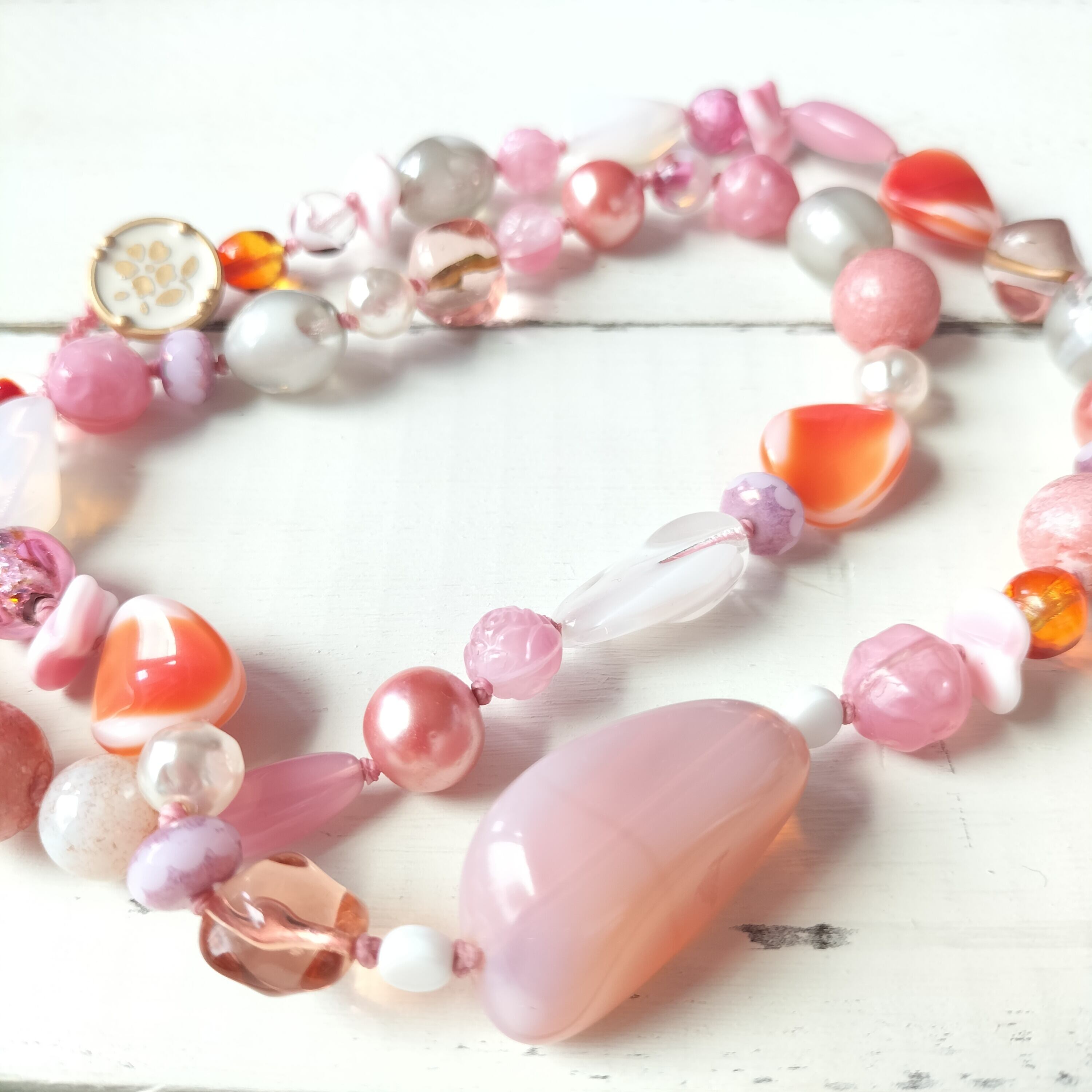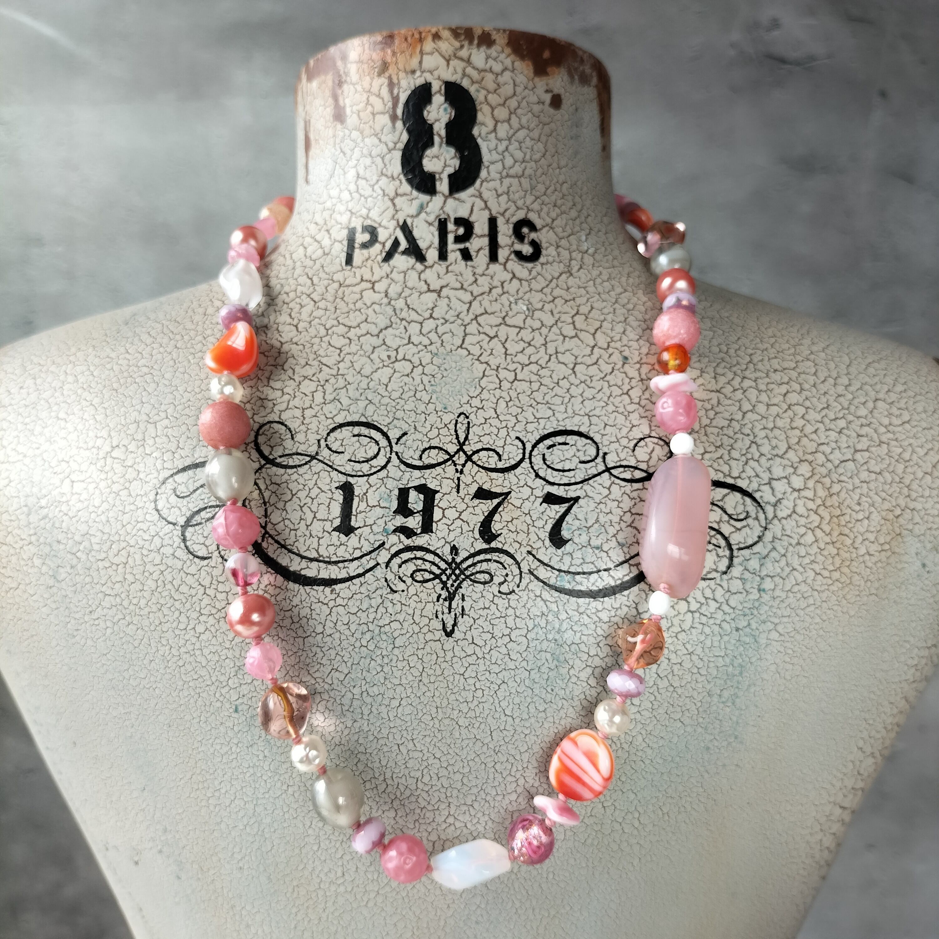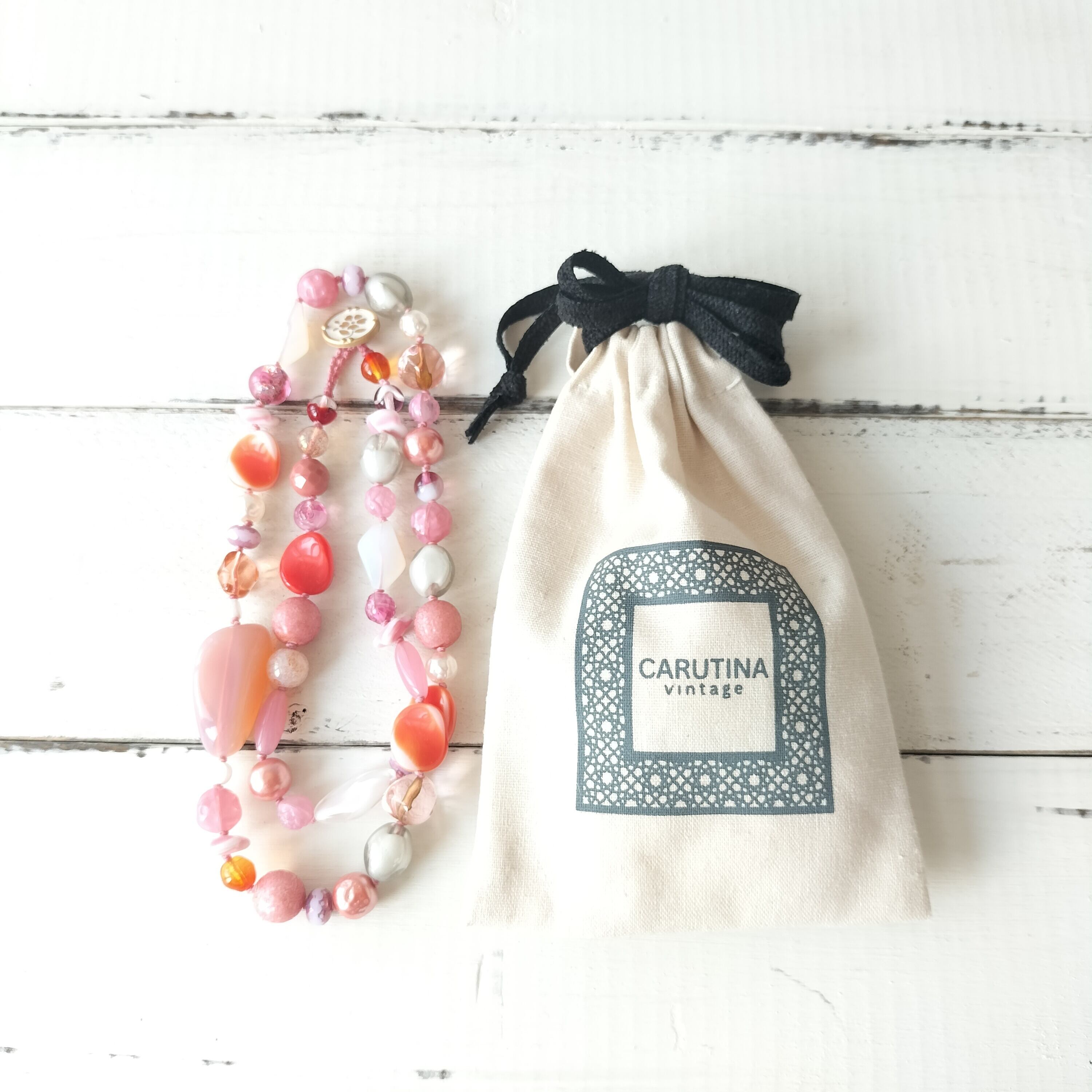 希少なヴィンテージ&アンティークビーズ ミルキーピンクの大ぶりガラスストーン 果実のコーラルレッド ネックレス 一粒ずつ糸で結ぶオールノット技法 アレルギーでも安心♡ フランス買付 ギフト無料 数量限定 高級感あるオリジナル巾着付き☆母の日ギフト 誕生日プレゼント❣️