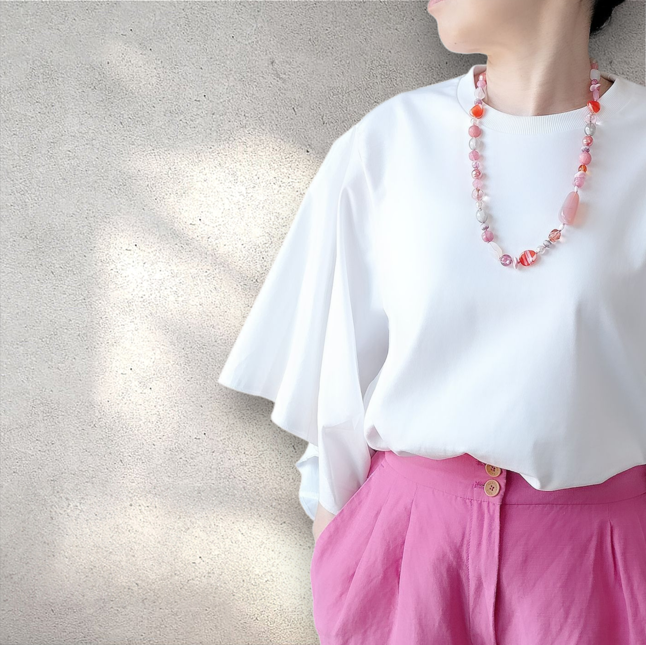 洗練された印象をプラスし、胸元に上品な華やぎを添えます。