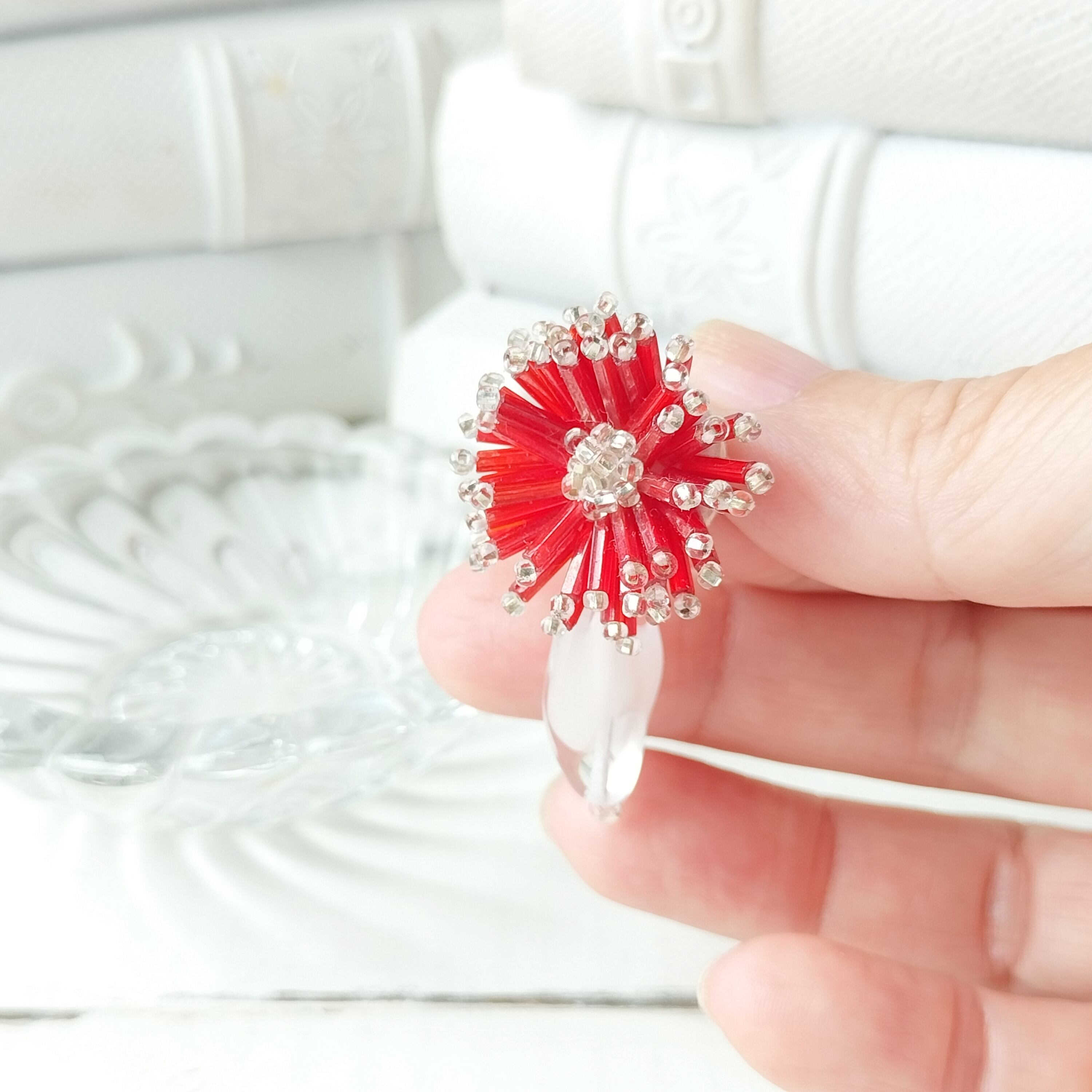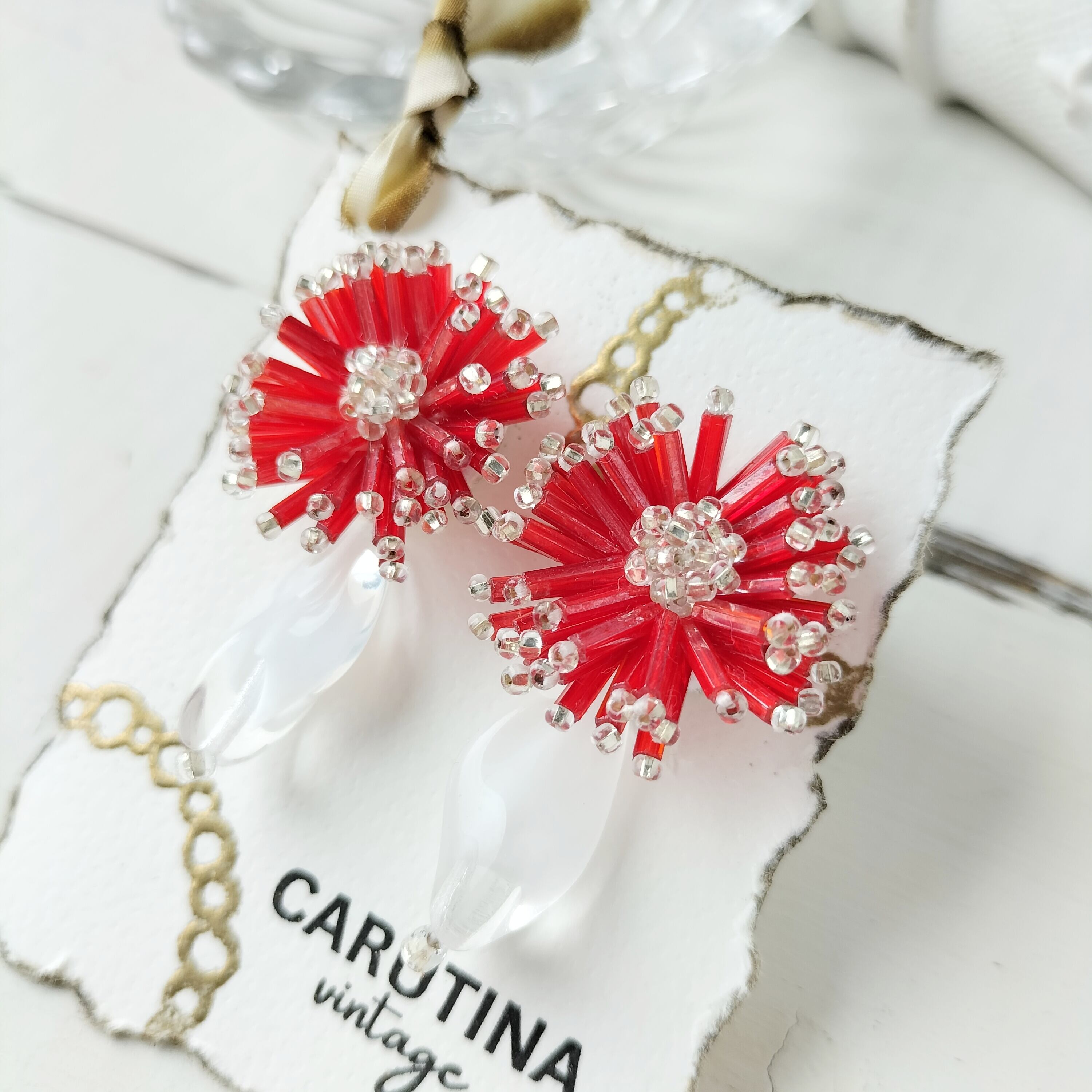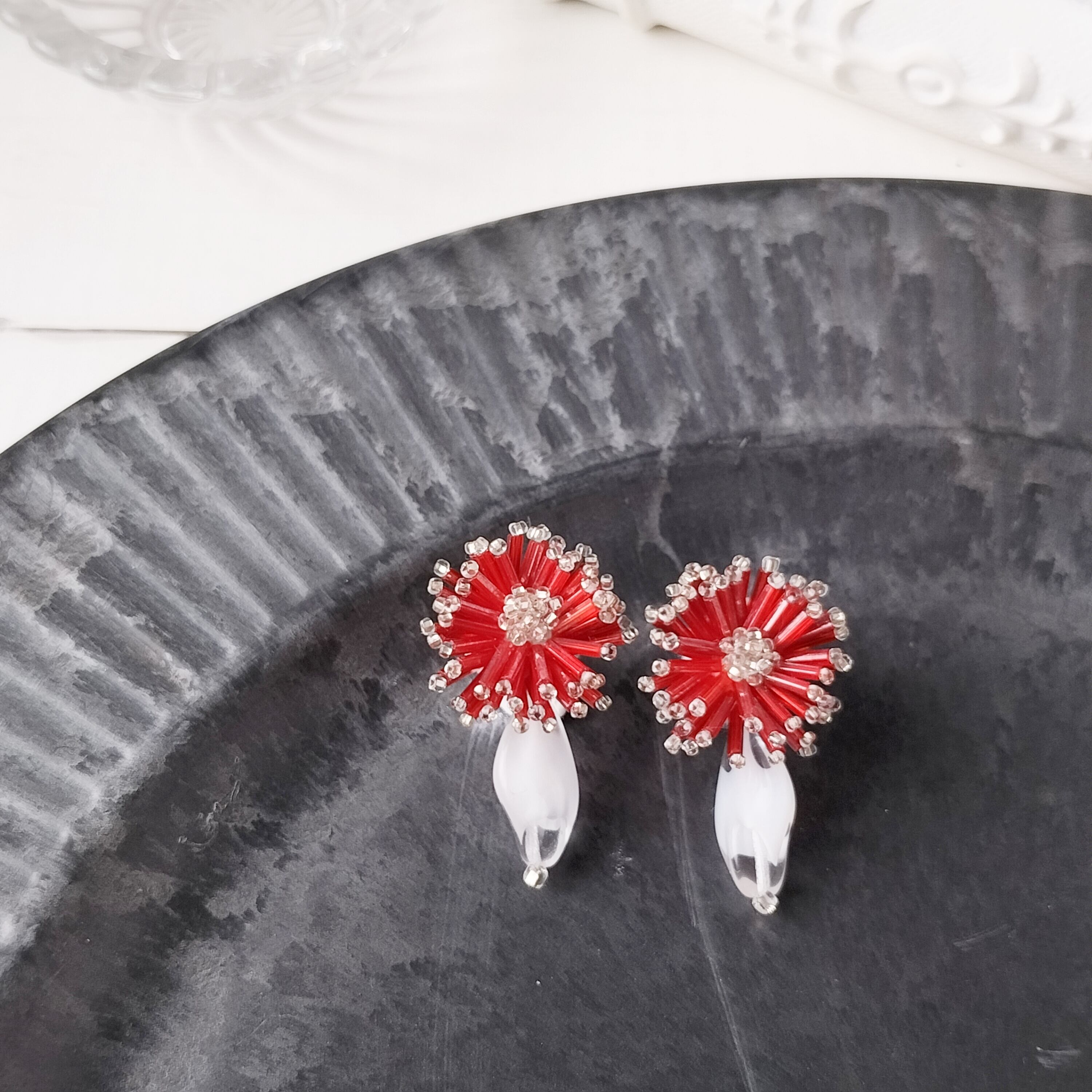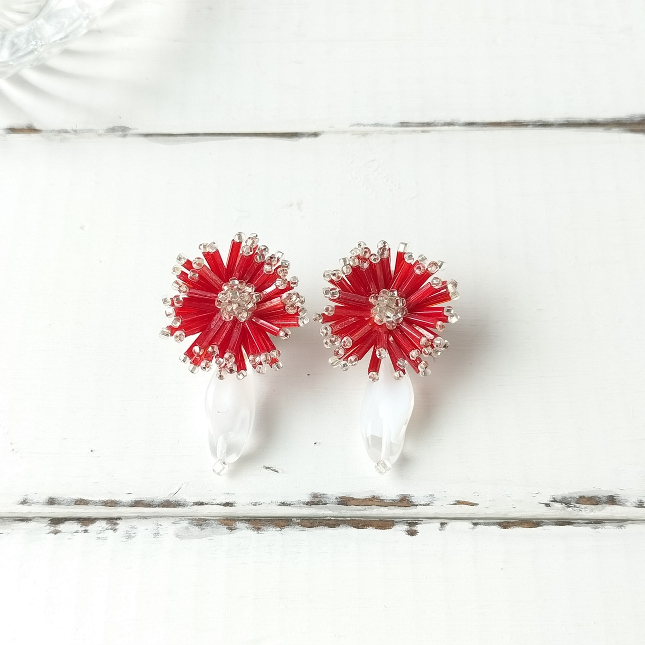 【フランス買付❣️】アンティーク深紅のビーズとヴィンテージのクリアホワイトが花咲くガーベラ イヤリング/ピアス アレルギー対応♡プレゼントにもおすすめ・ギフトボックス無料♡