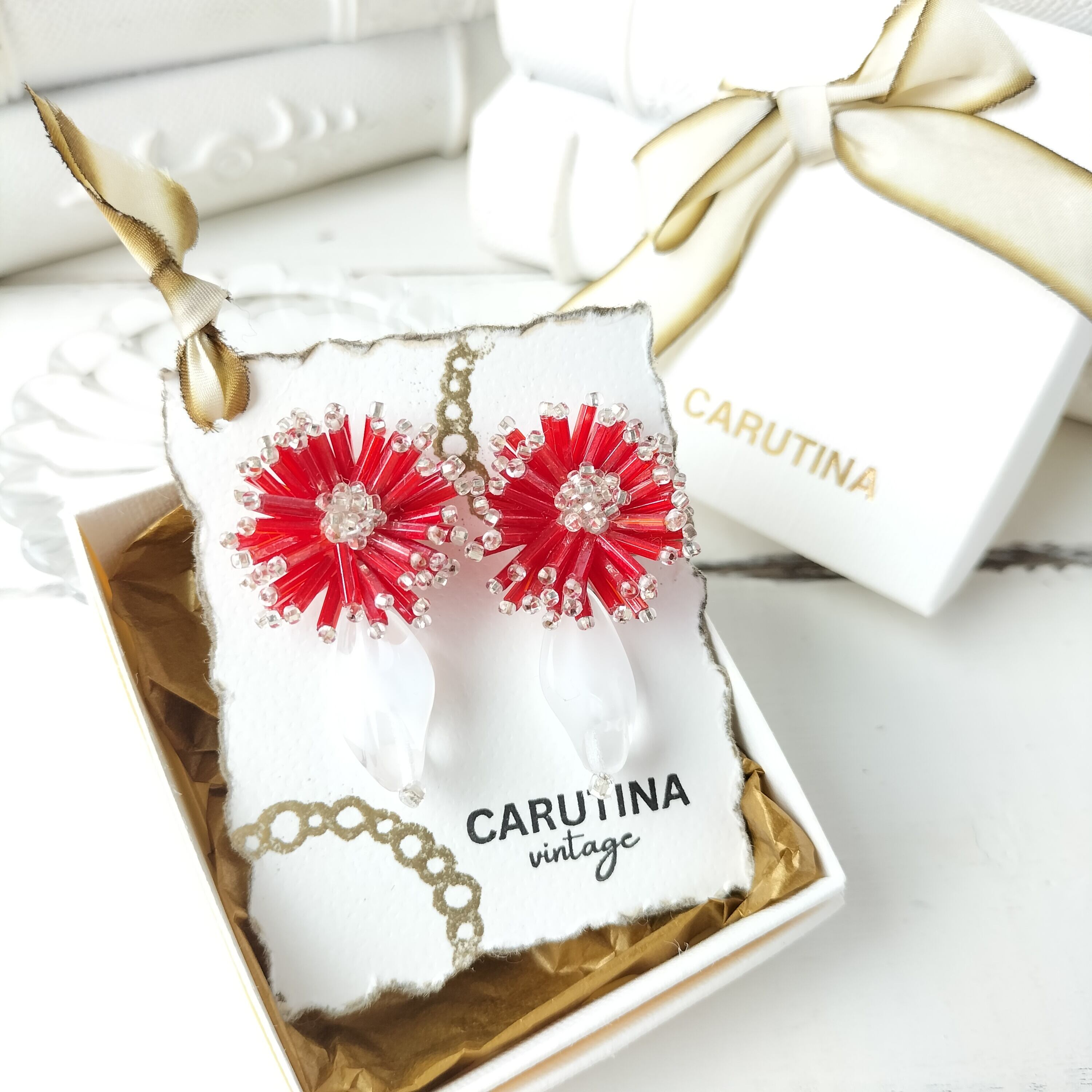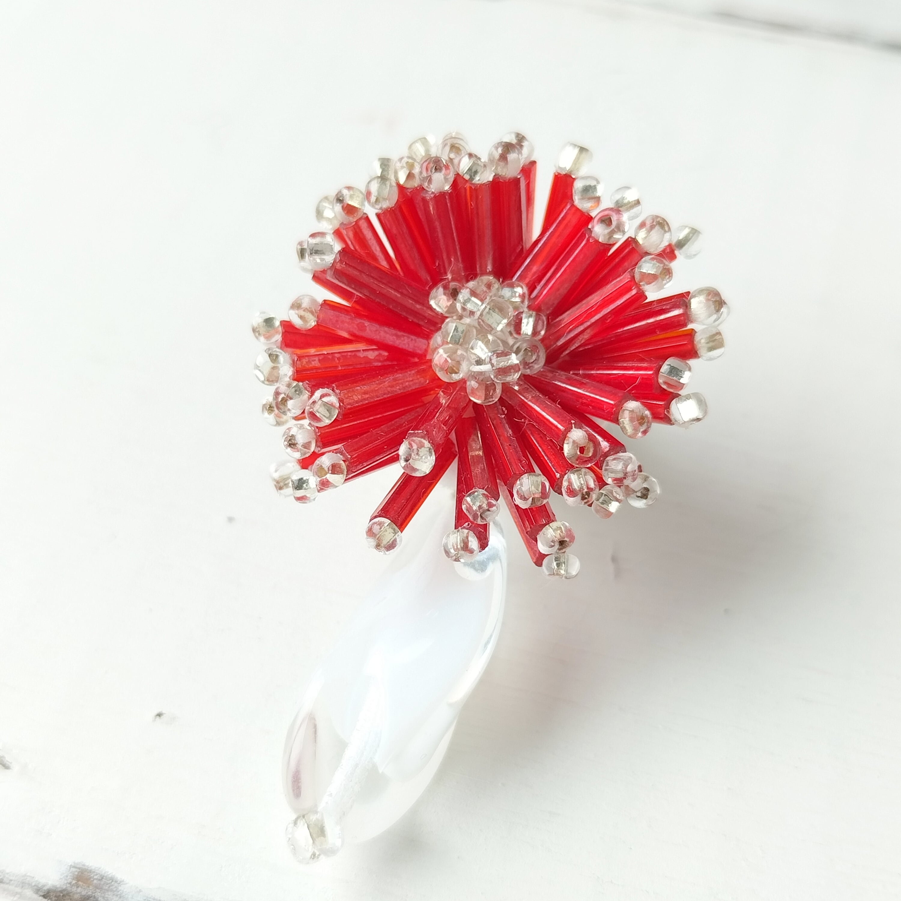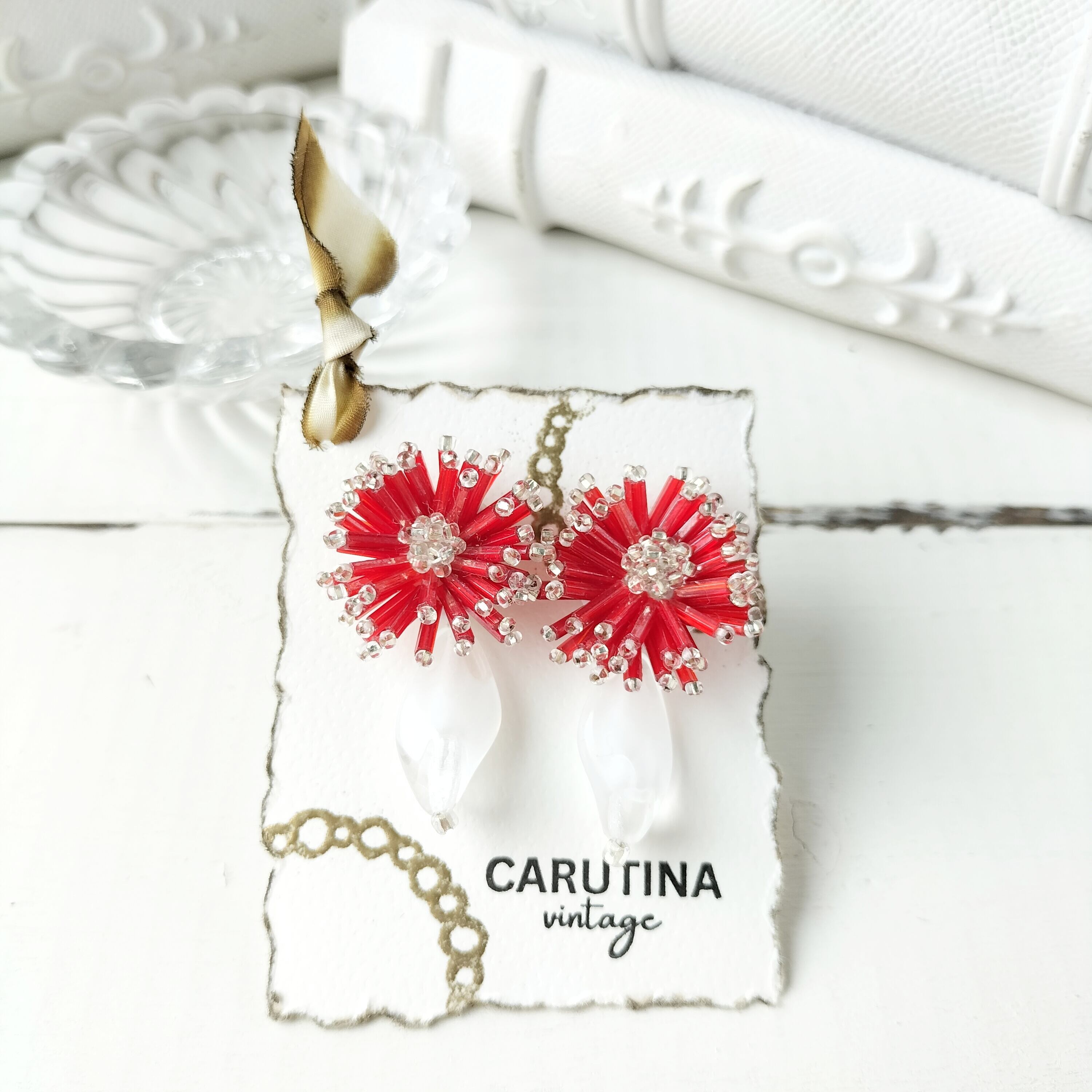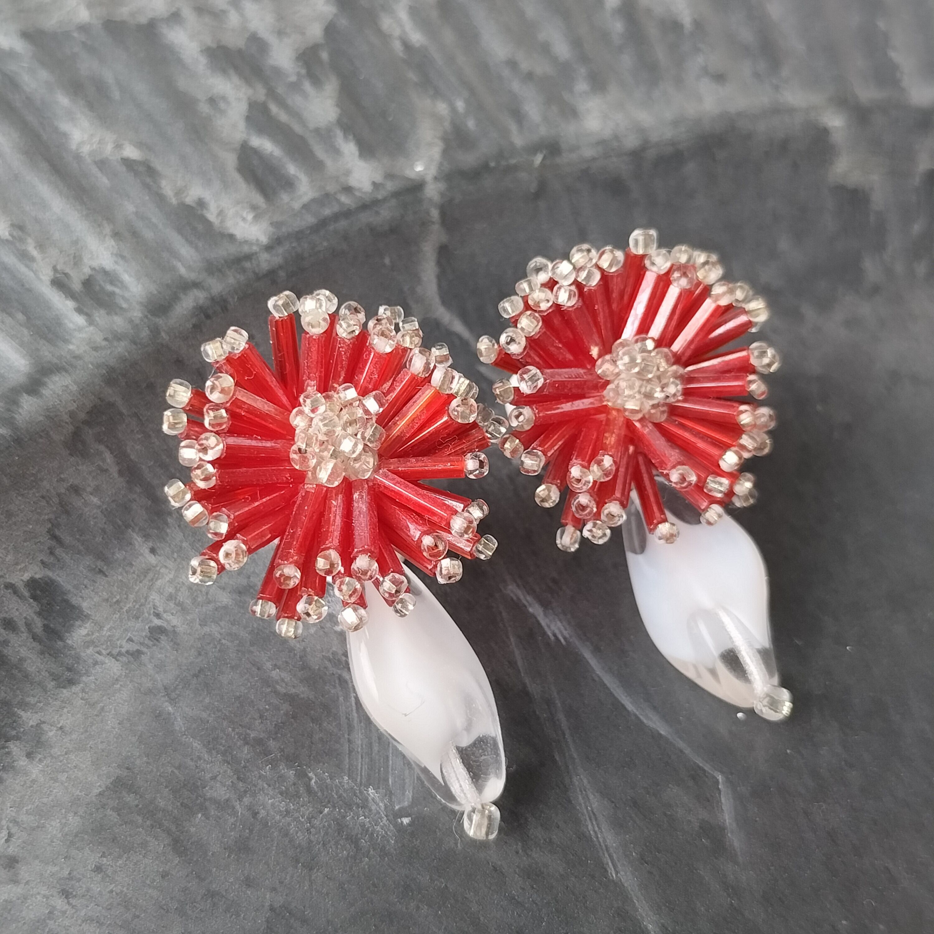 【フランス買付❣️】アンティーク深紅のビーズとヴィンテージのクリアホワイトが花咲くガーベラ イヤリング/ピアス アレルギー対応♡プレゼントにもおすすめ・ギフトボックス無料♡