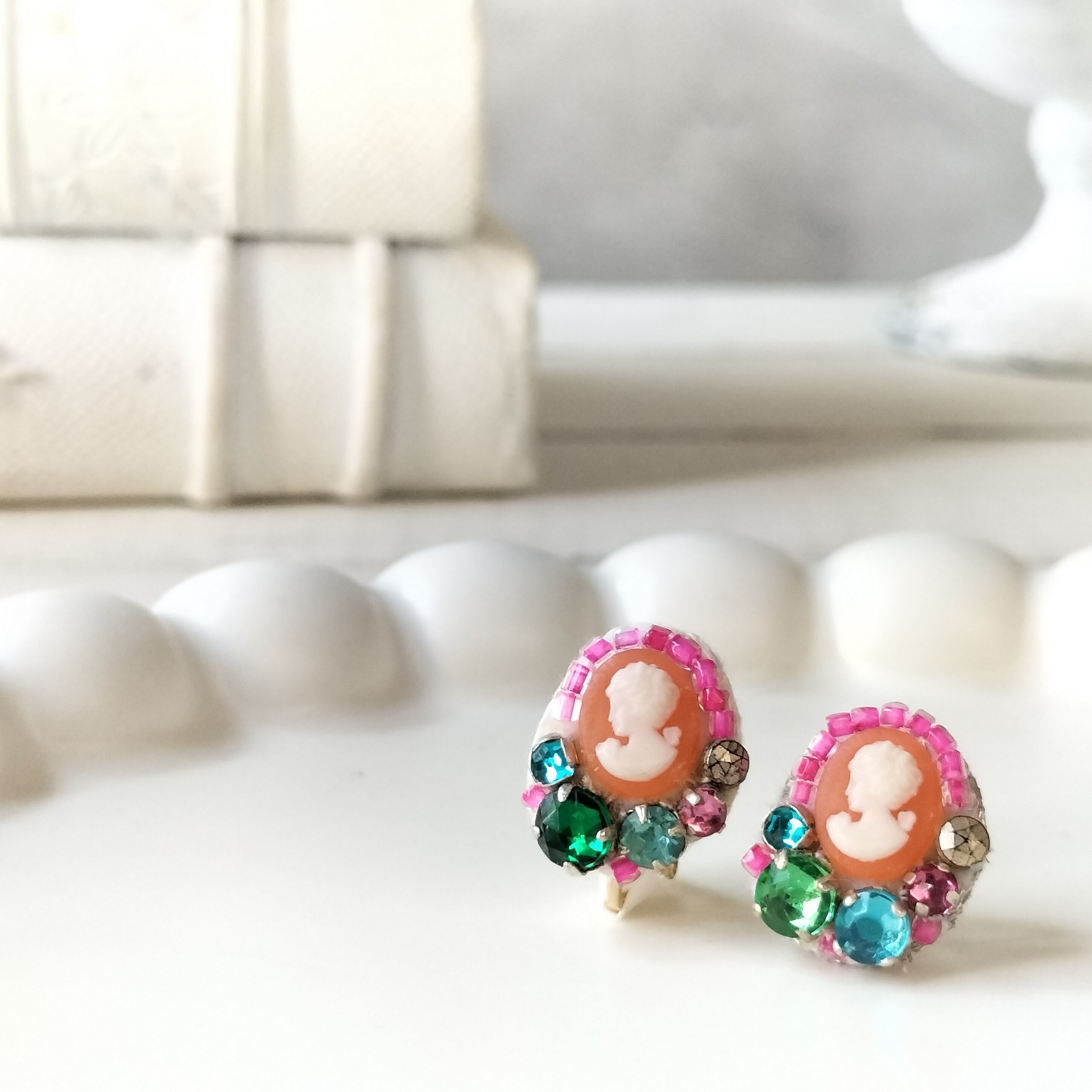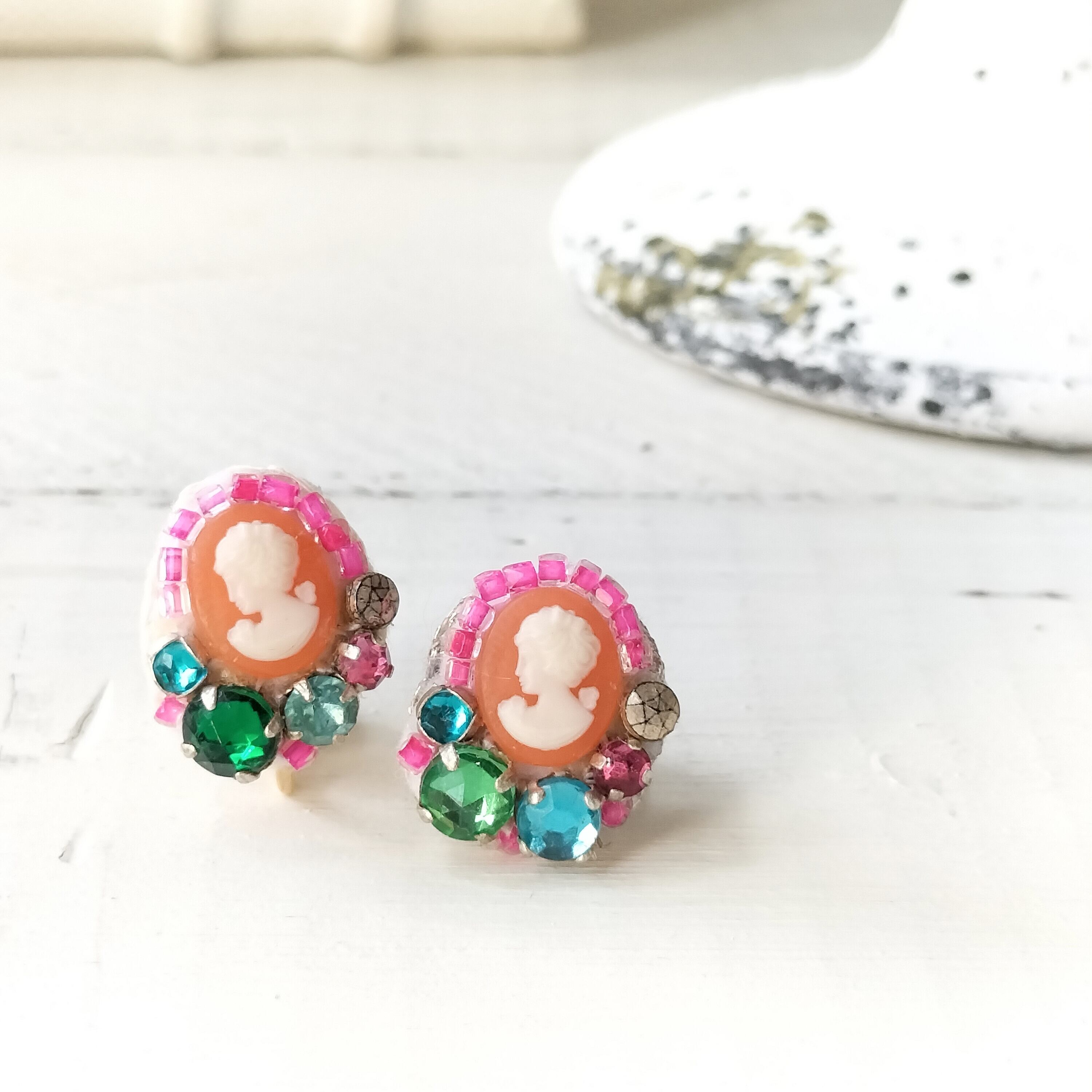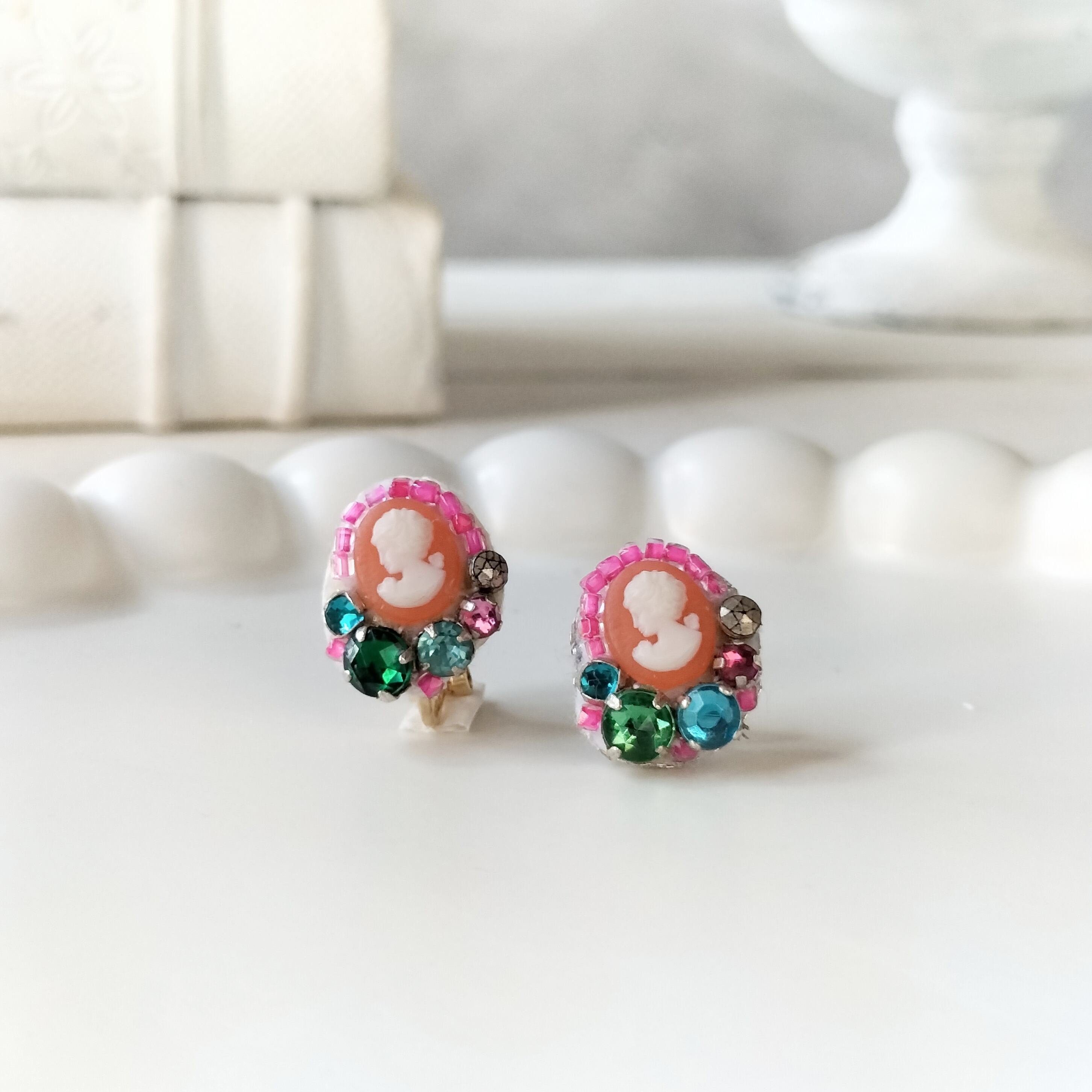 【フランス買付】華奢なカメオと年代物ラインストーンの深みのある輝き ヴィンテージとアンティークビーズ ピアス/イヤリング アレルギー対応・プレゼントにもおすすめ・ギフトボックス無料