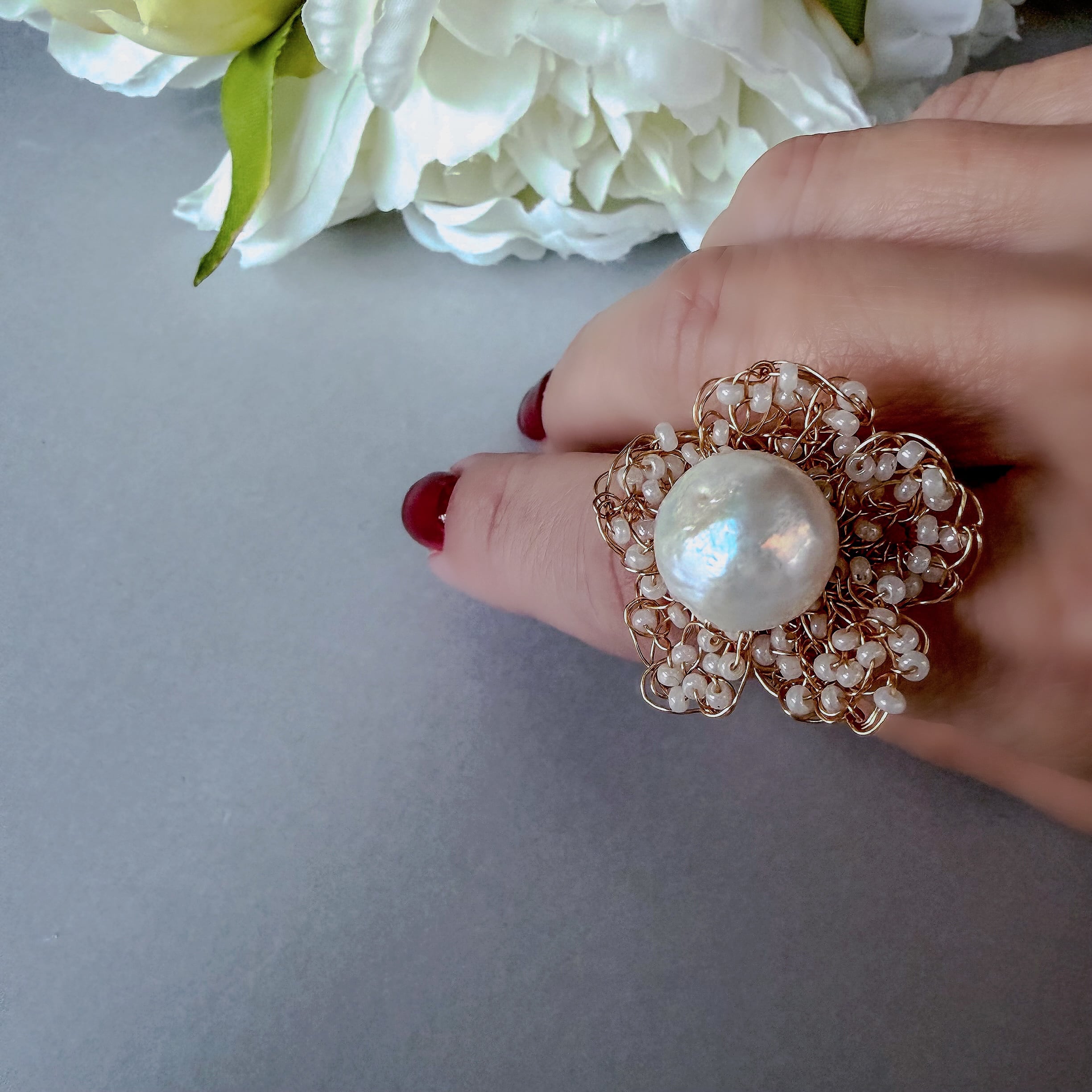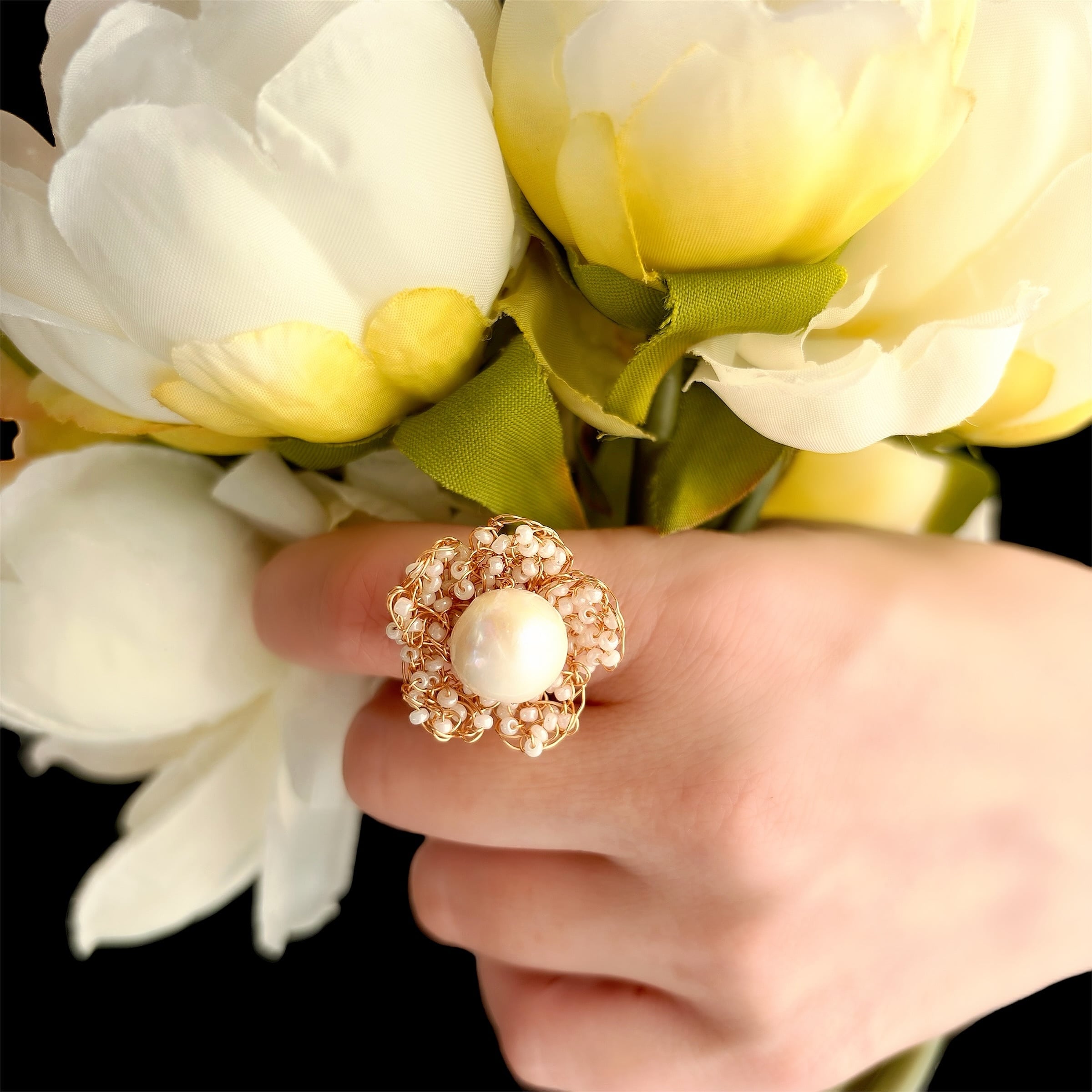 新作 極細ワイヤー編み 大粒淡水パール×アンティークビーズ 小花 フリーサイズリング 指輪 アレルギー対応 ギフト無料 ギフトボックス付 送料無料 結婚式 ウェディング パーティー フォーマル