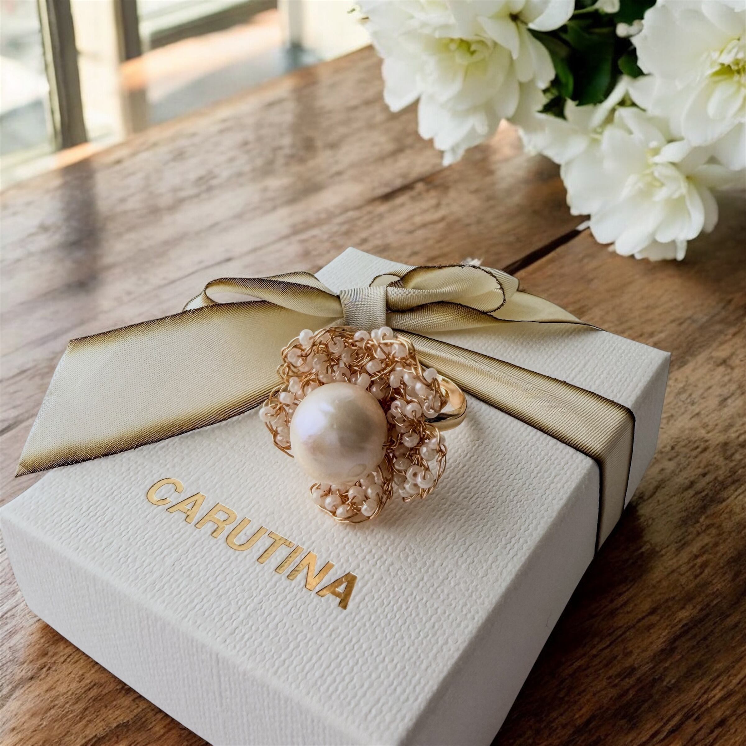 中心には存在感のある大粒の淡水パール