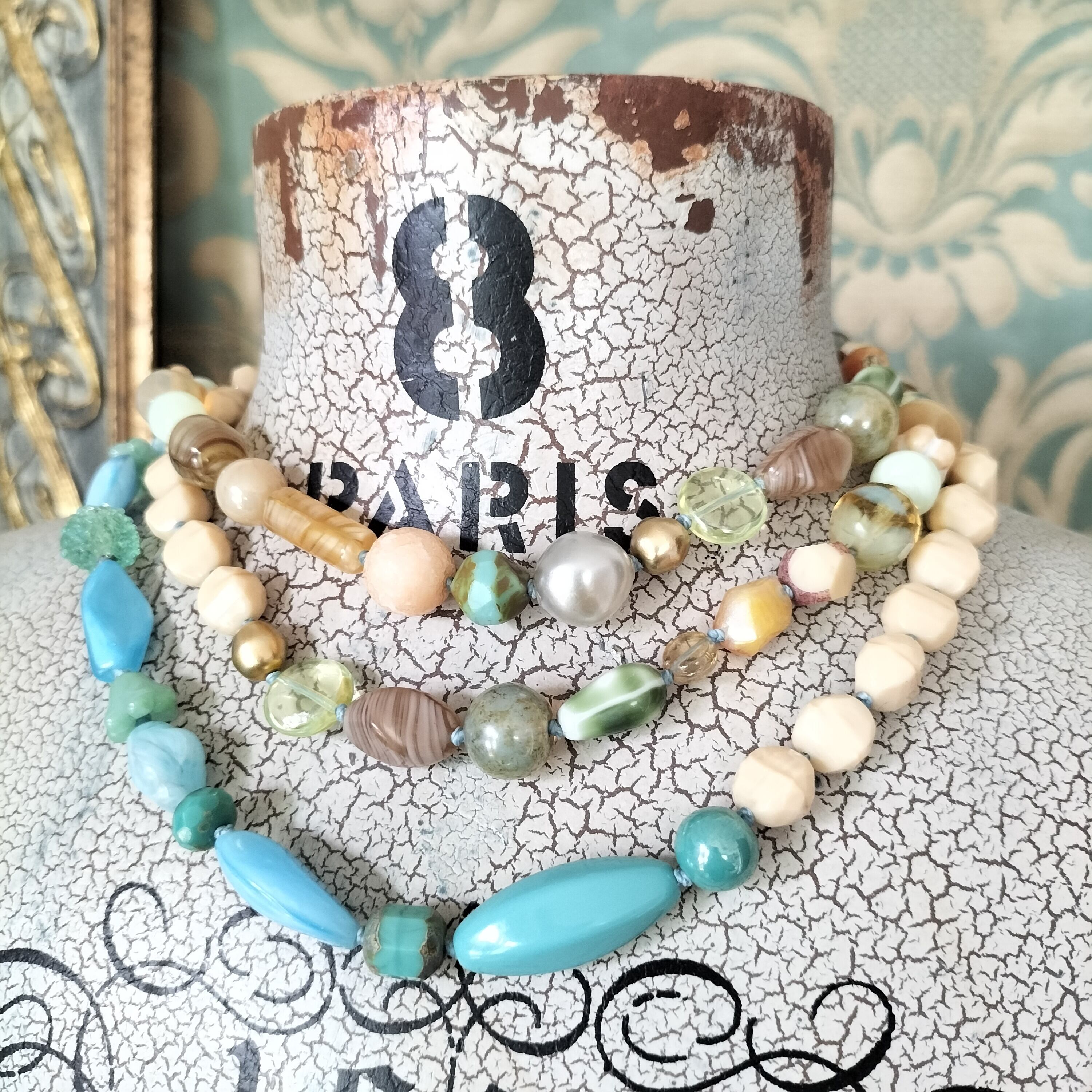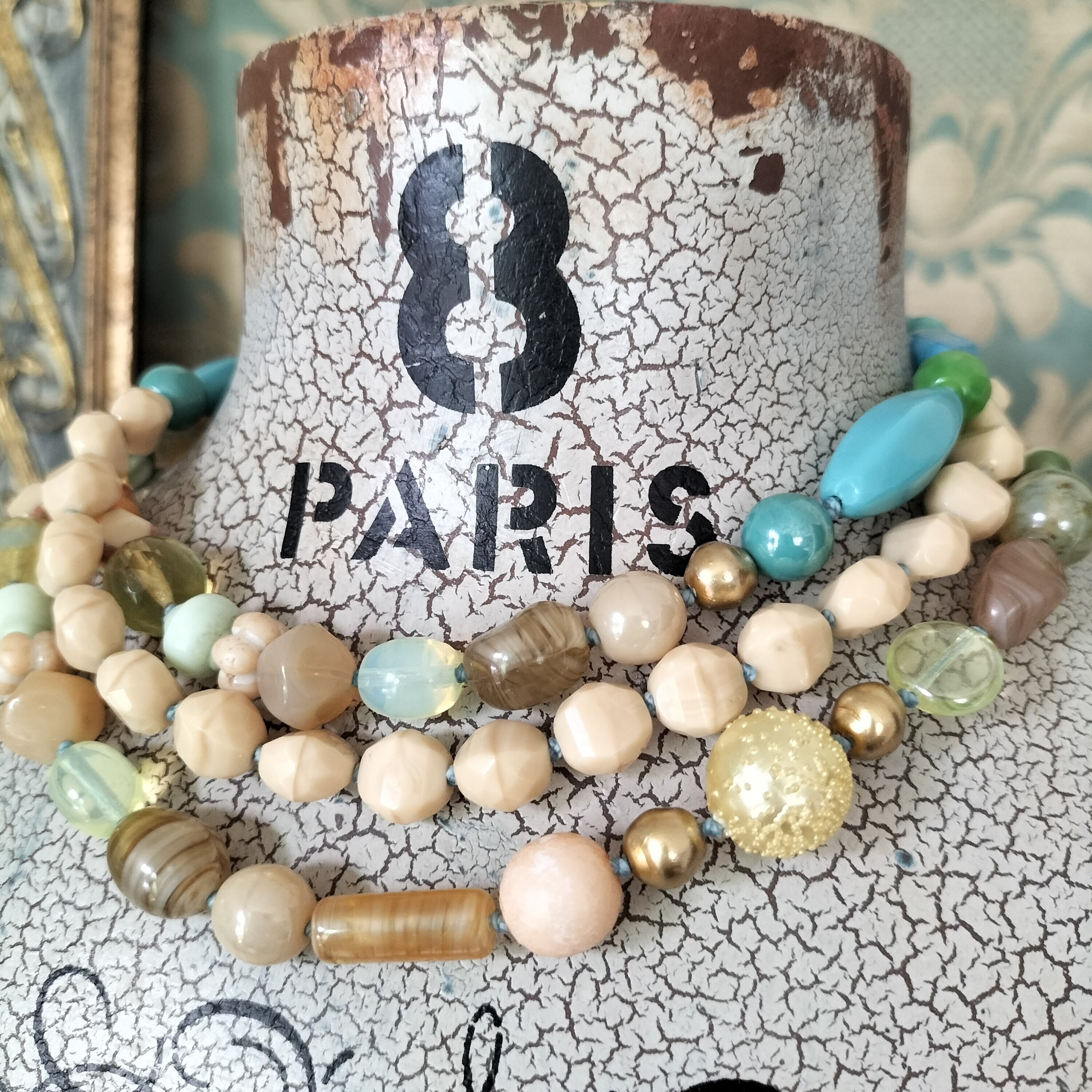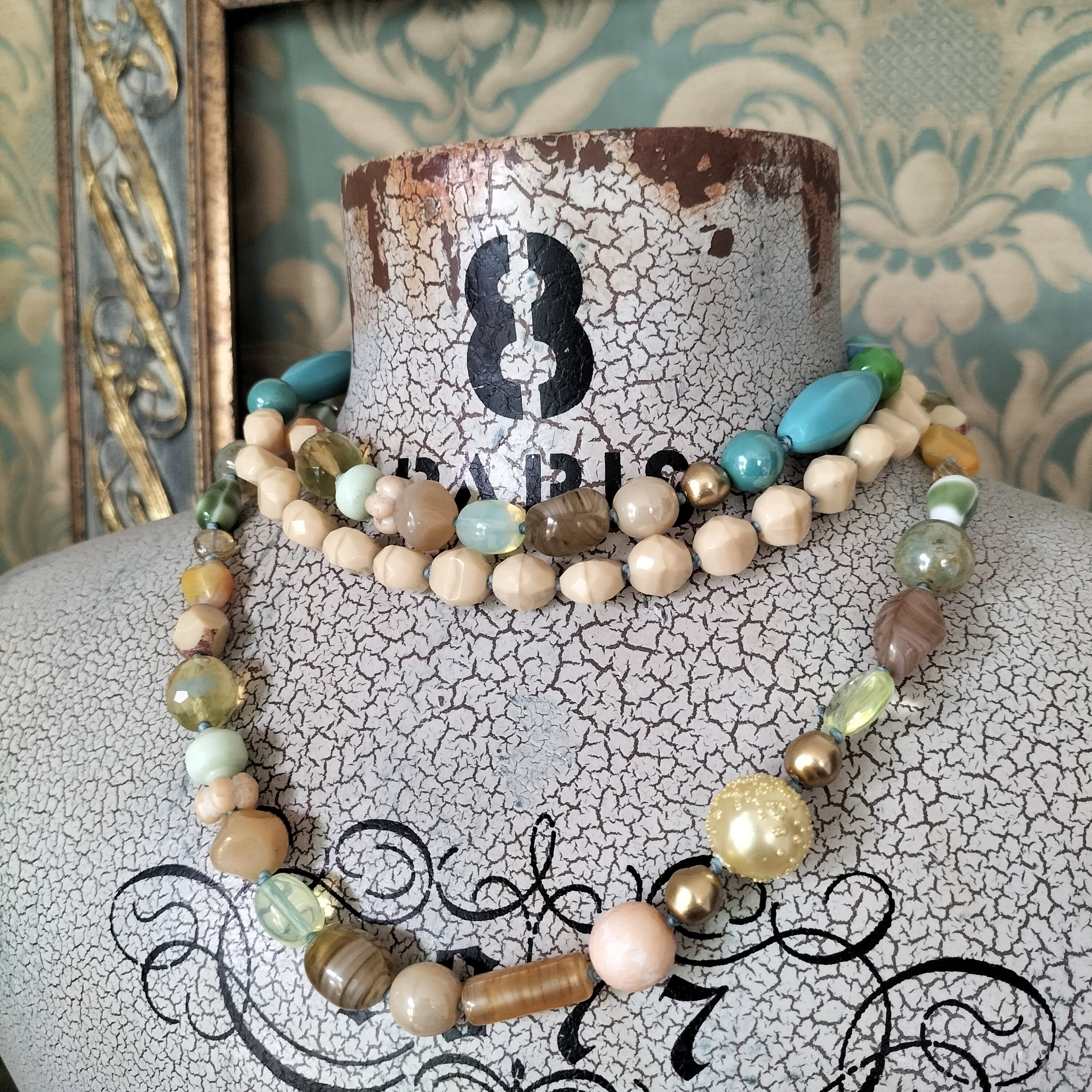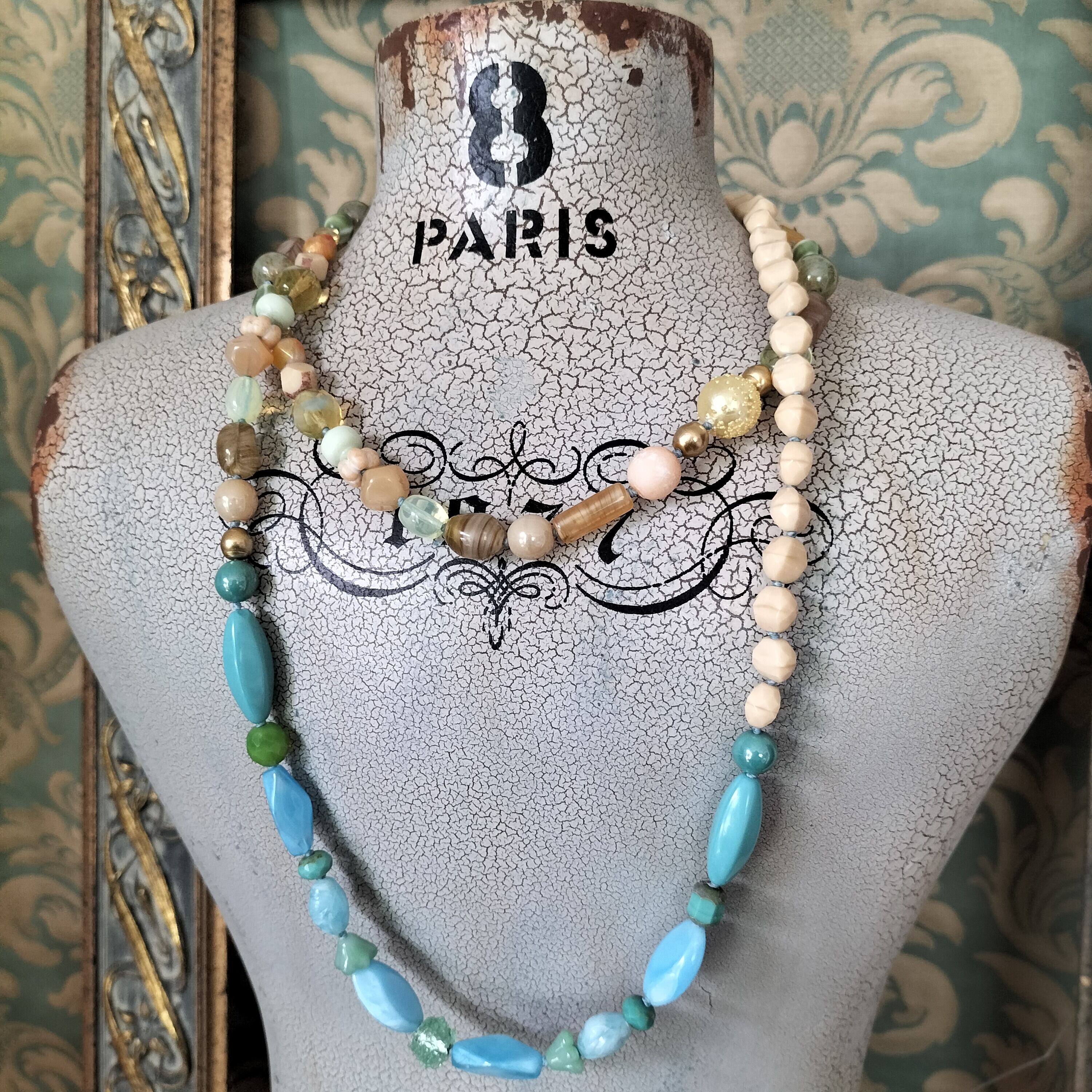 希少なヴィンテージ&アンティークビーズ ノスタルジーなベージュと空色のバイカラー ロングネックレス 3連もOK♡ 一粒ずつ糸で結ぶオールノット技法 アレルギーでも安心♡ フランス買付 ギフト無料 数量限定 高級感あるオリジナル巾着付き☆母の日ギフト 誕生日プレゼント❣️