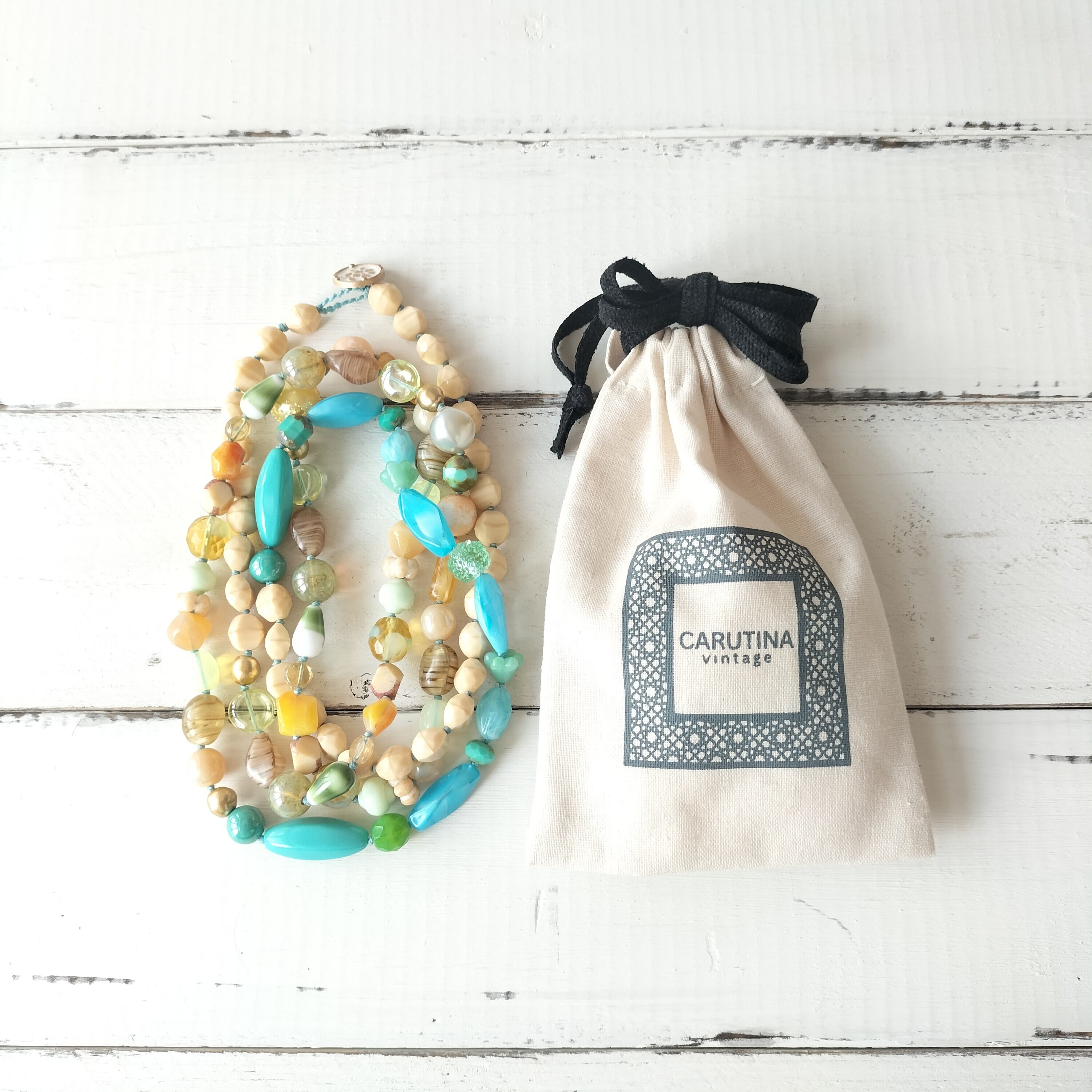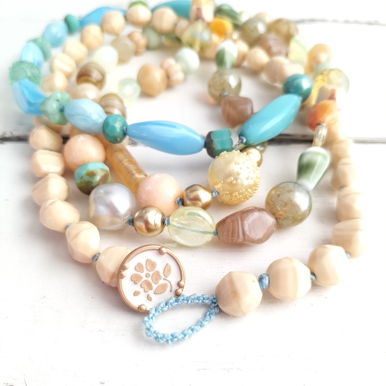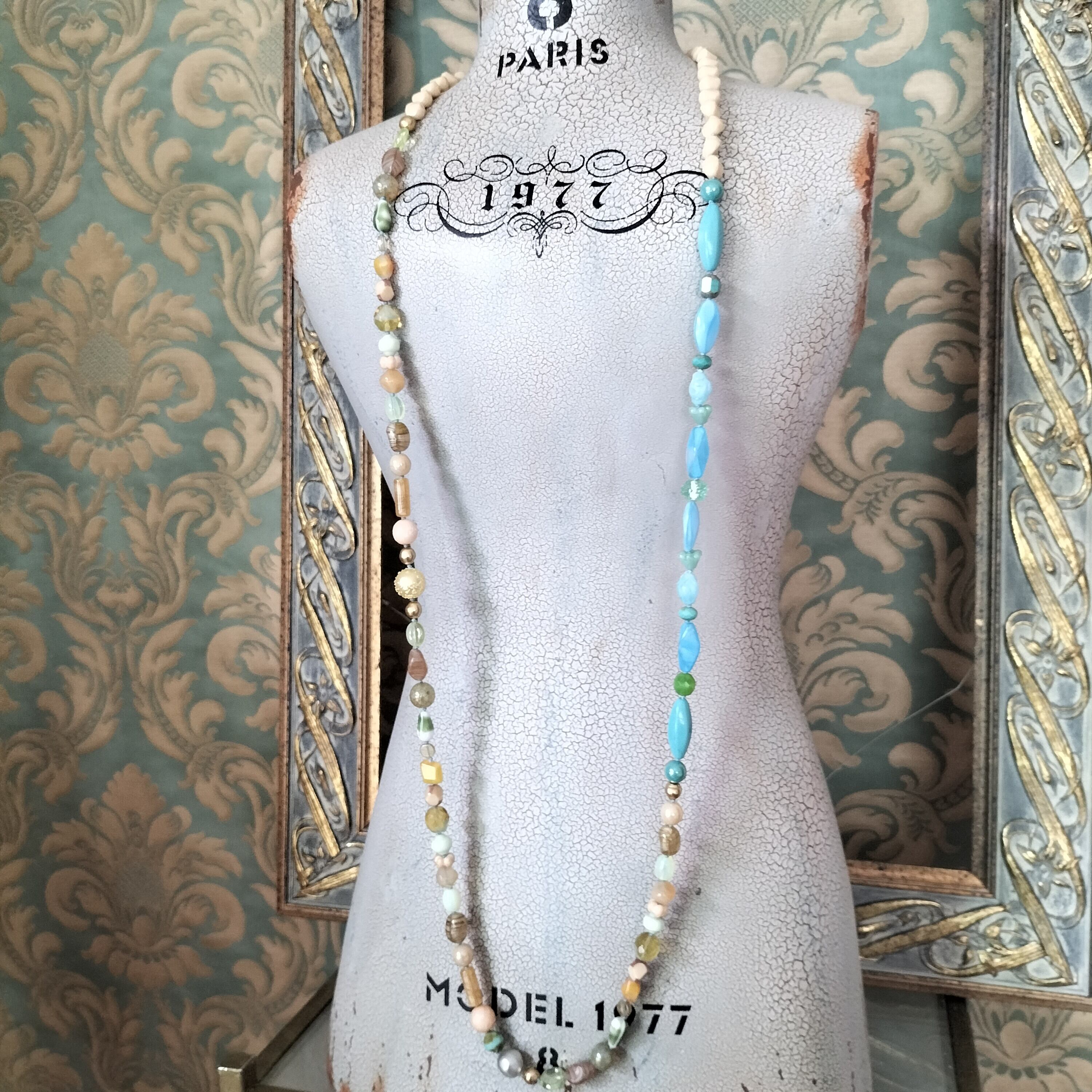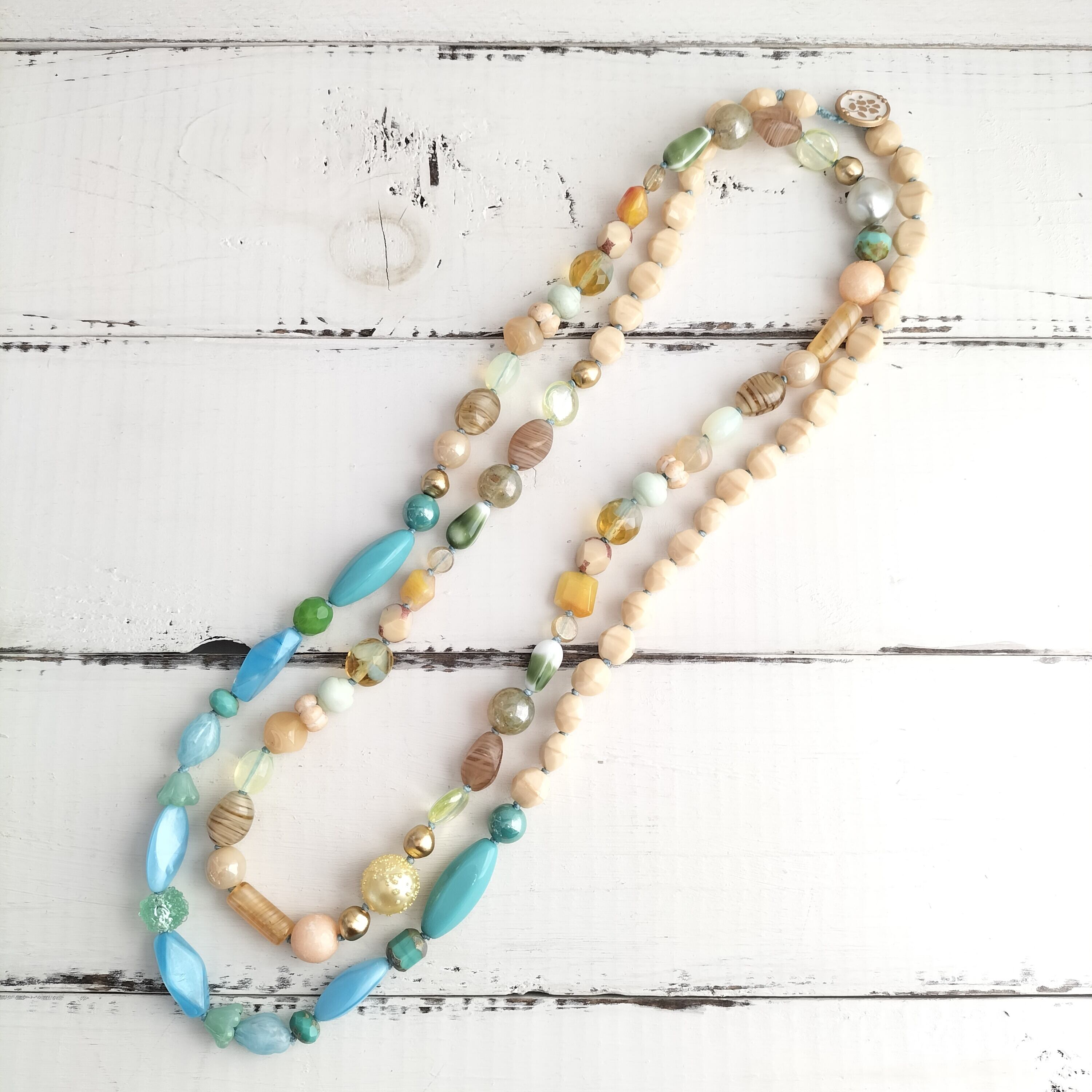 希少なヴィンテージ&アンティークビーズ ノスタルジーなベージュと空色のバイカラー ロングネックレス 3連もOK♡ 一粒ずつ糸で結ぶオールノット技法 アレルギーでも安心♡ フランス買付 ギフト無料 数量限定 高級感あるオリジナル巾着付き☆母の日ギフト 誕生日プレゼント❣️
