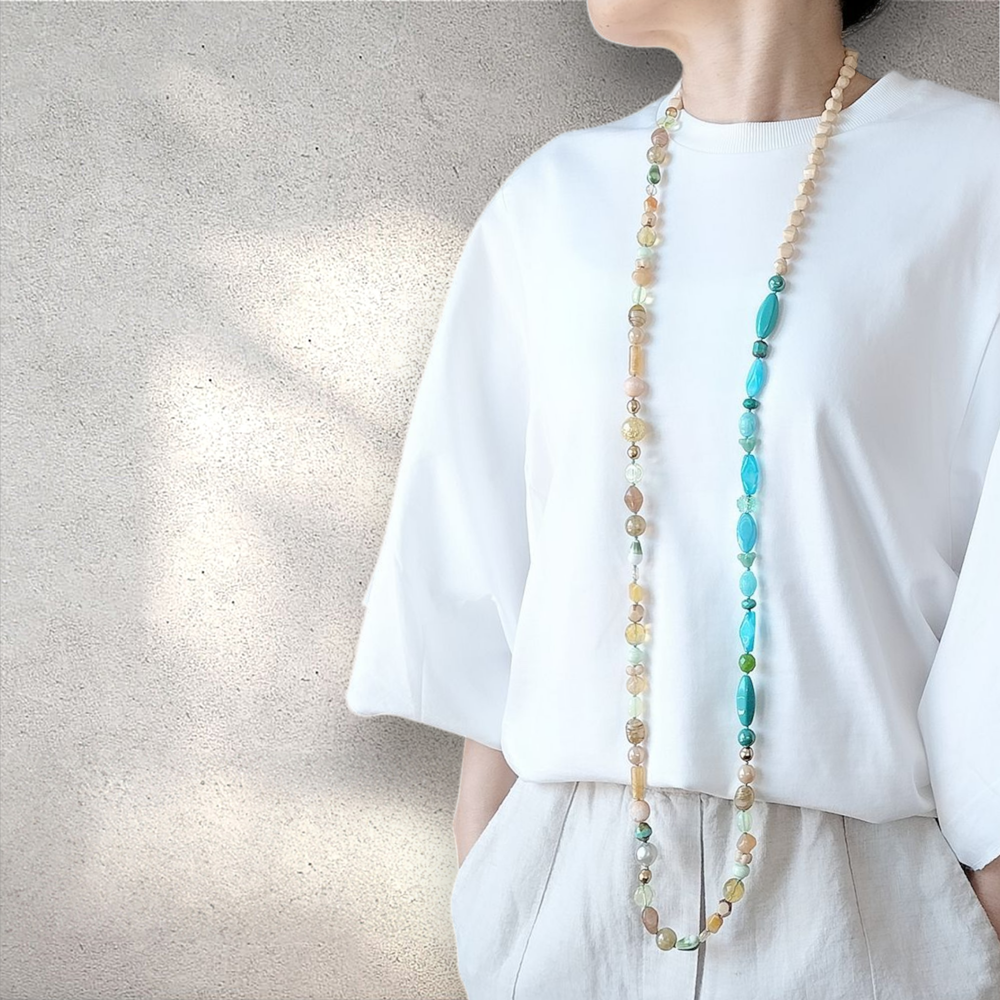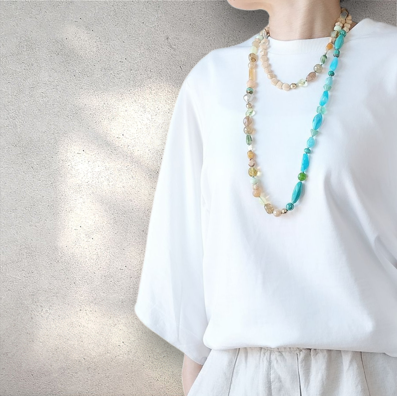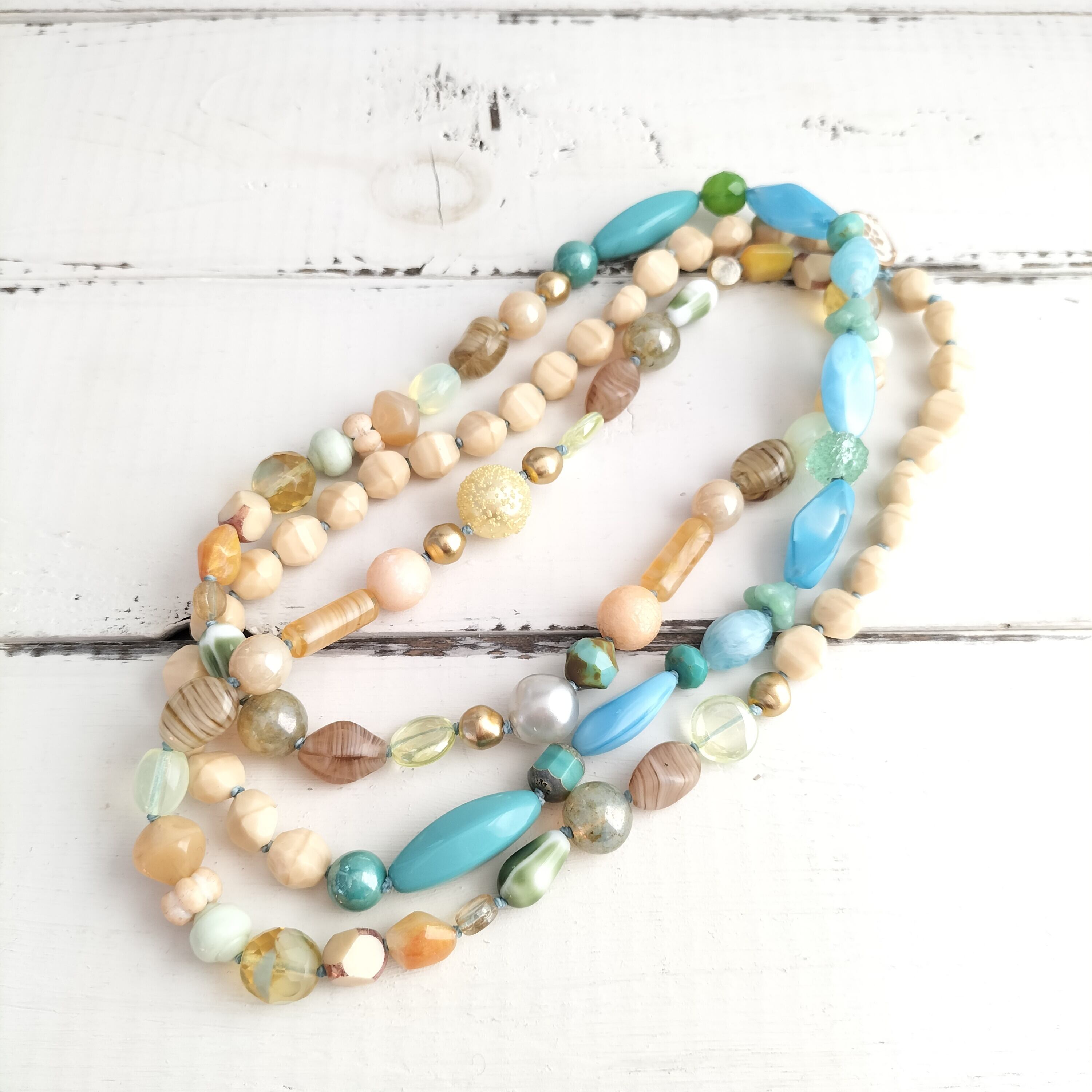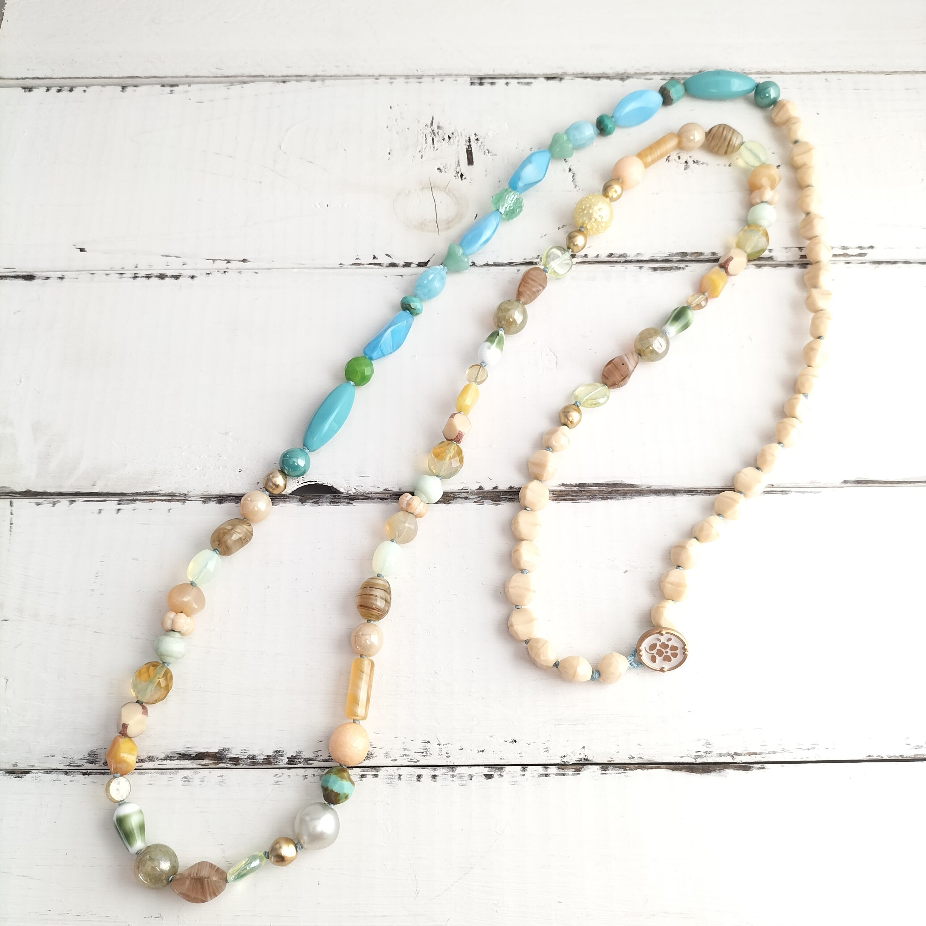 希少なヴィンテージ&アンティークビーズ ノスタルジーなベージュと空色のバイカラー ロングネックレス 3連もOK♡ 一粒ずつ糸で結ぶオールノット技法 アレルギーでも安心♡ フランス買付 ギフト無料 数量限定 高級感あるオリジナル巾着付き☆母の日ギフト 誕生日プレゼント❣️