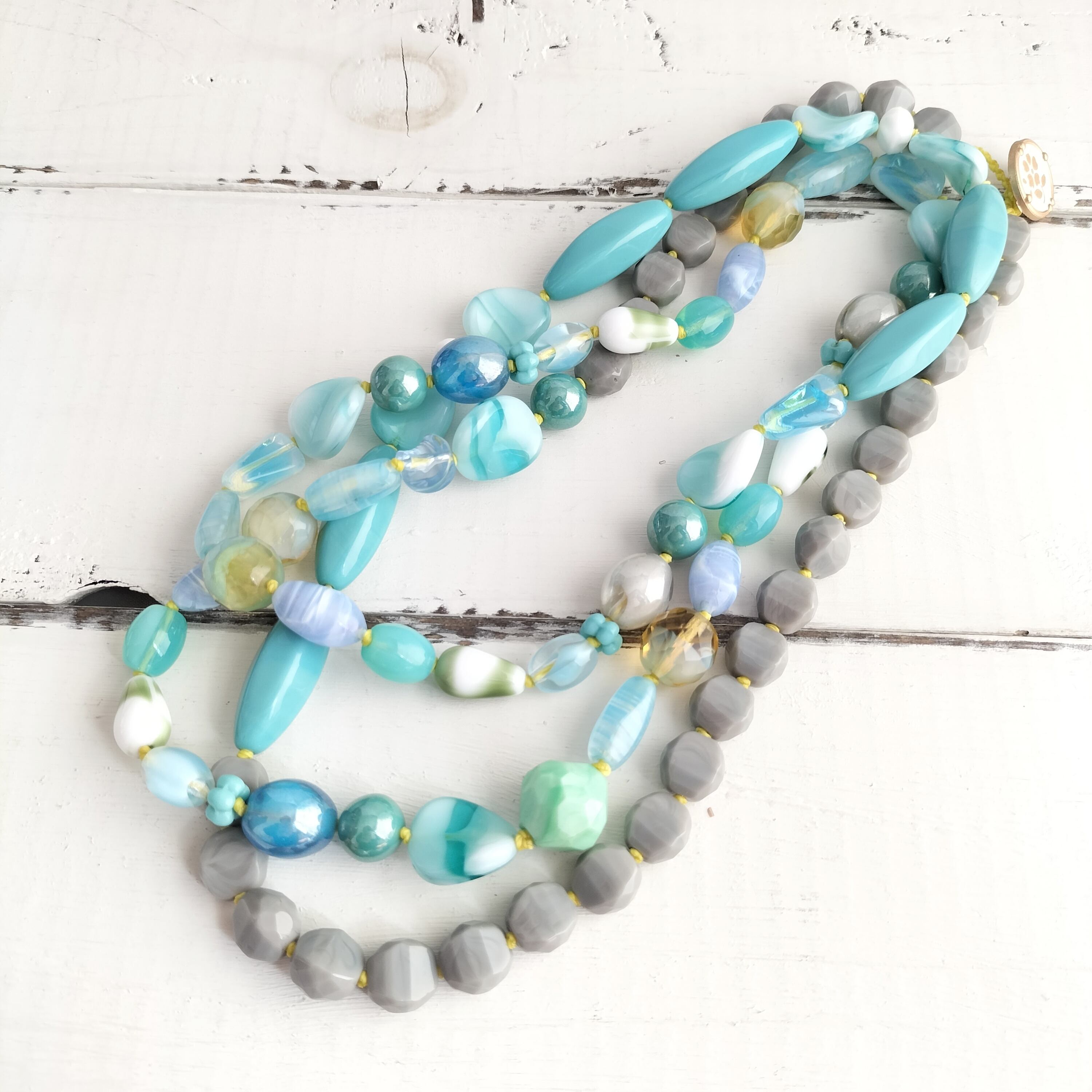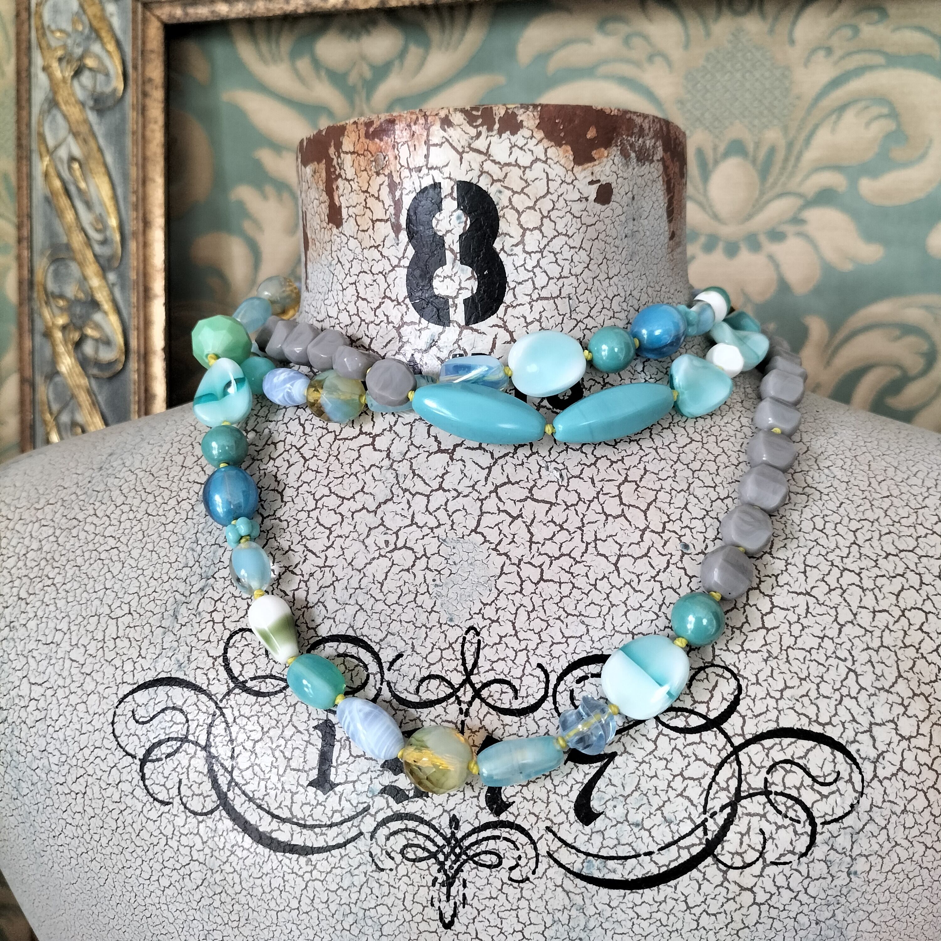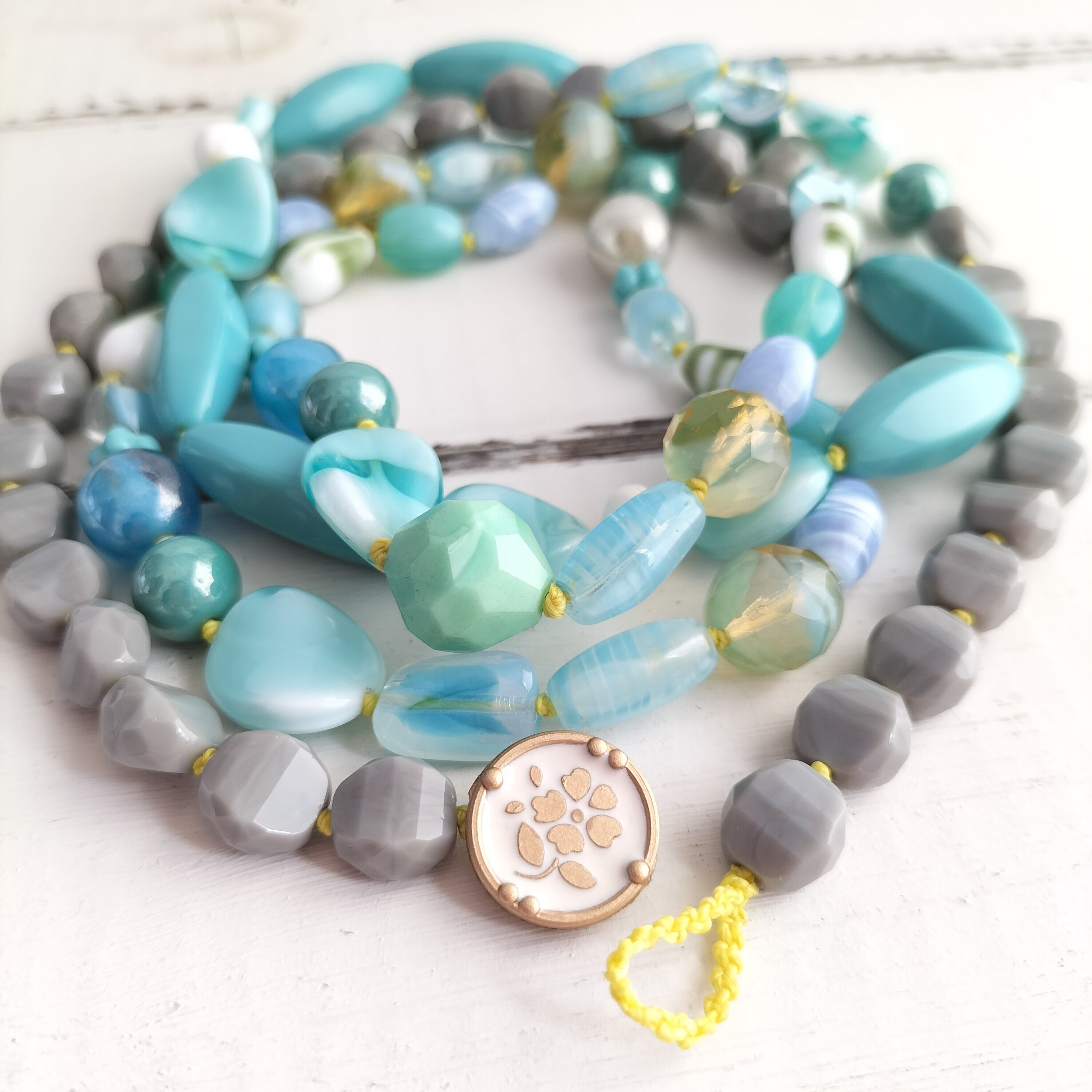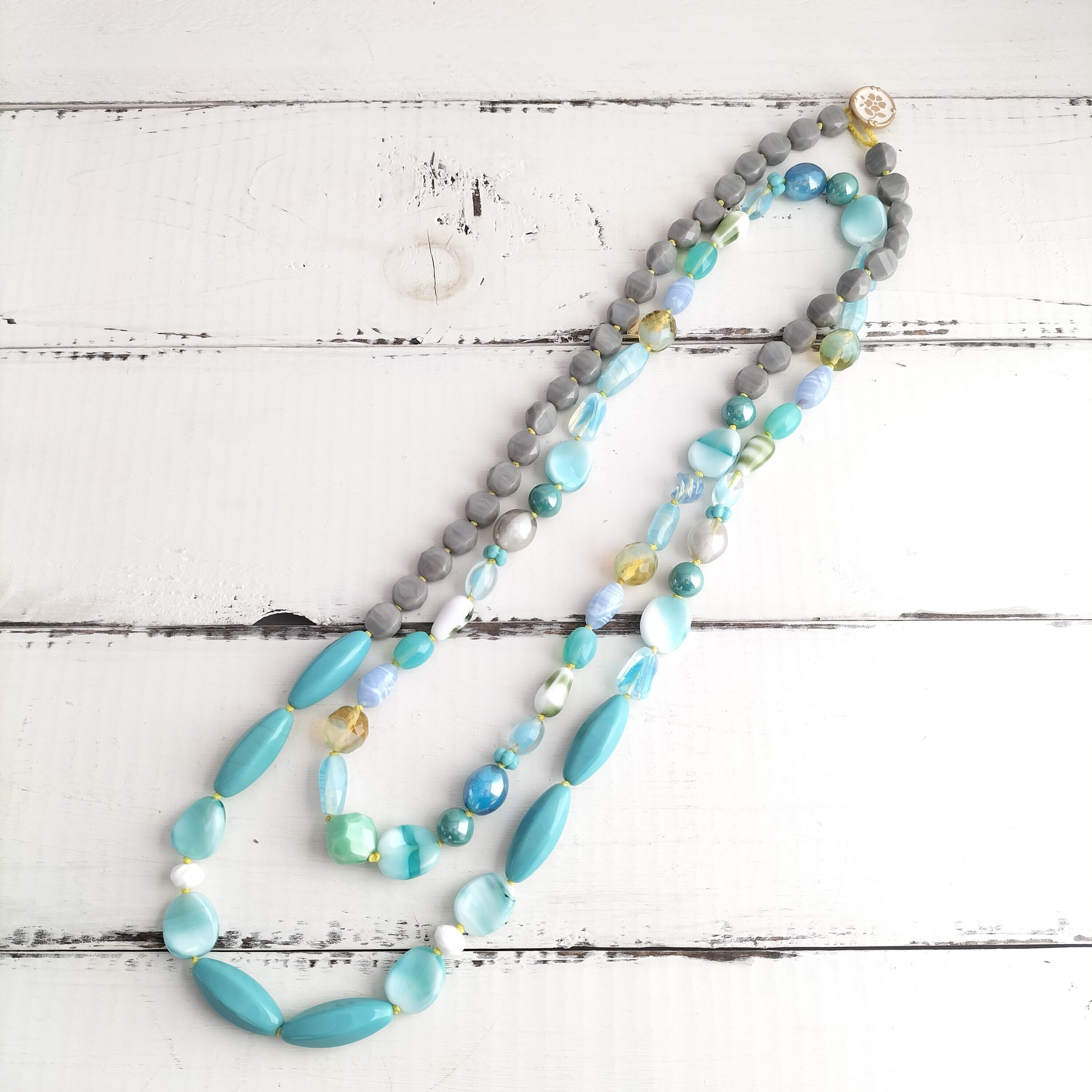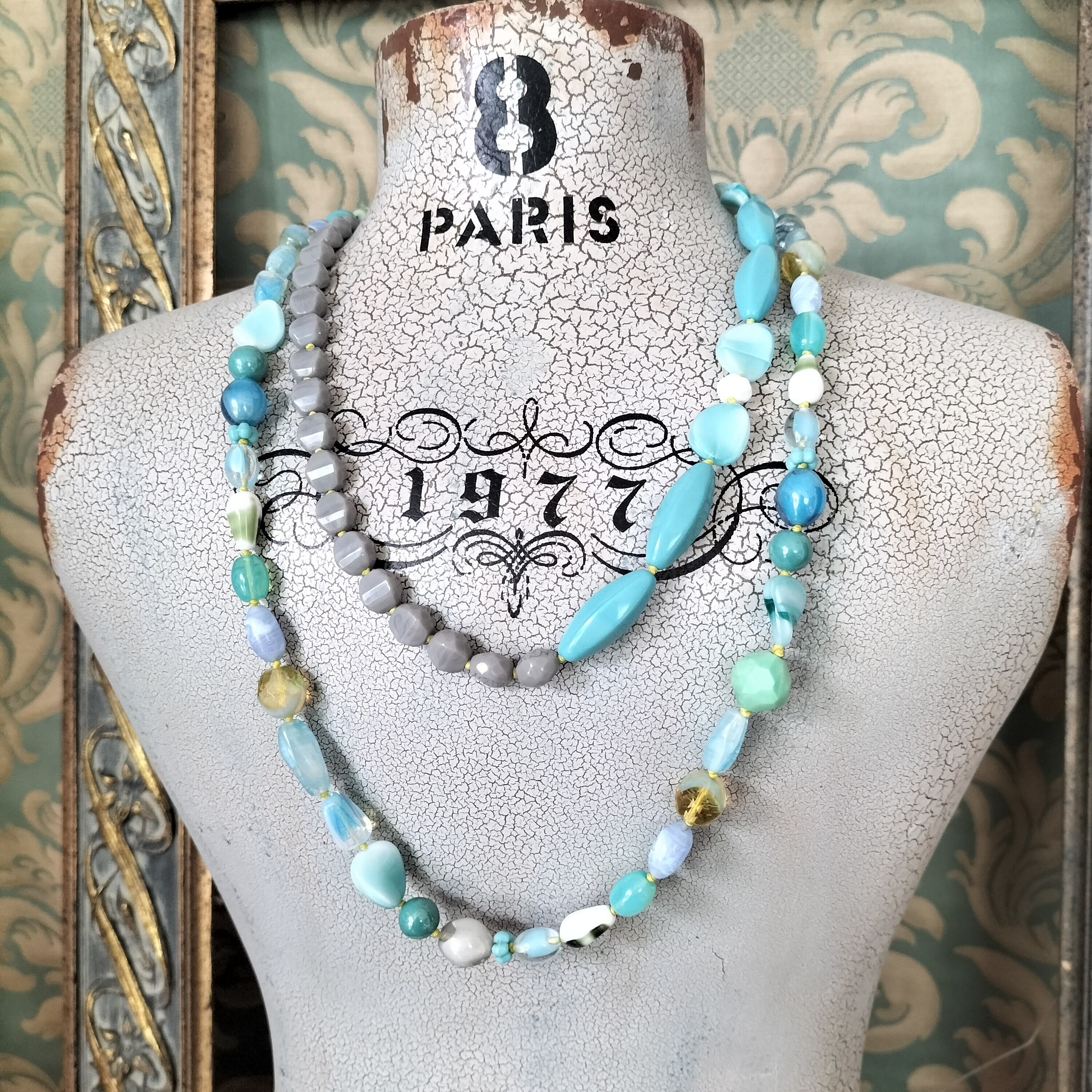 希少なヴィンテージ&アンティークビーズ シックな大人グレーと夏空ブルーのバイカラー ロングネックレス 3連もOK♡一粒ずつ糸で結ぶオールノット技法 アレルギーでも安心♡ フランス買付 ギフト無料 数量限定 高級感あるオリジナル巾着付き☆母の日ギフト 誕生日プレゼント❣️