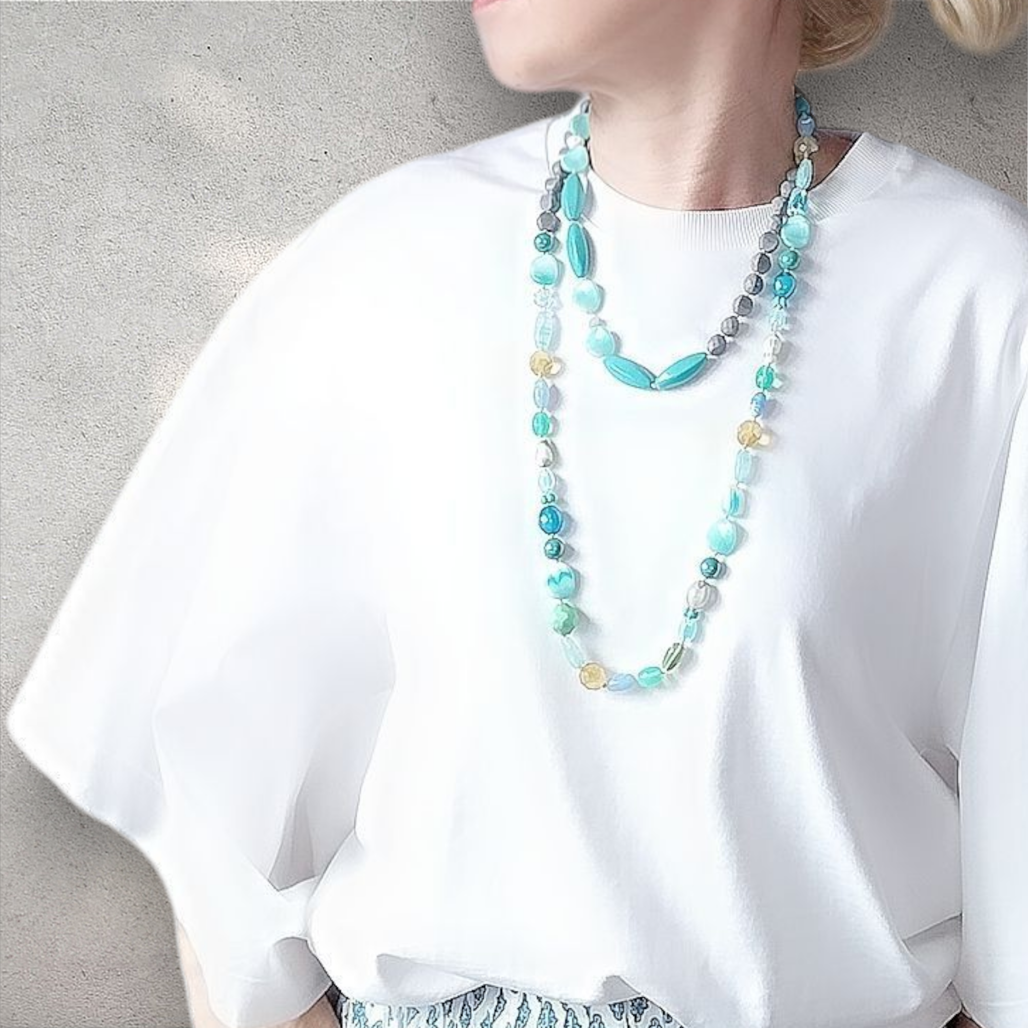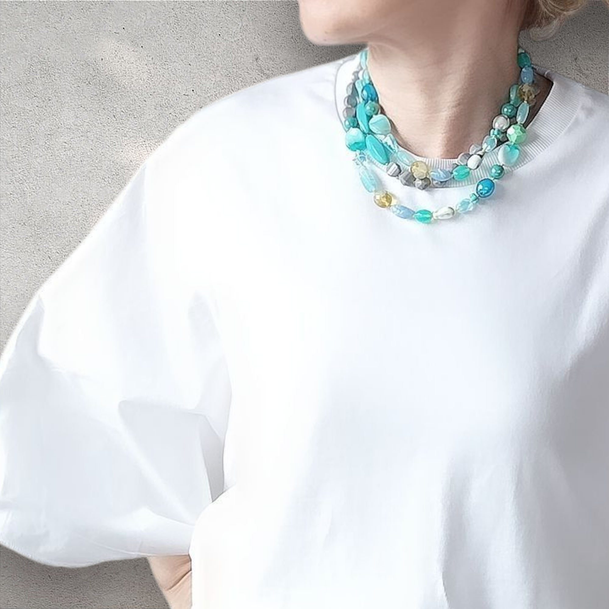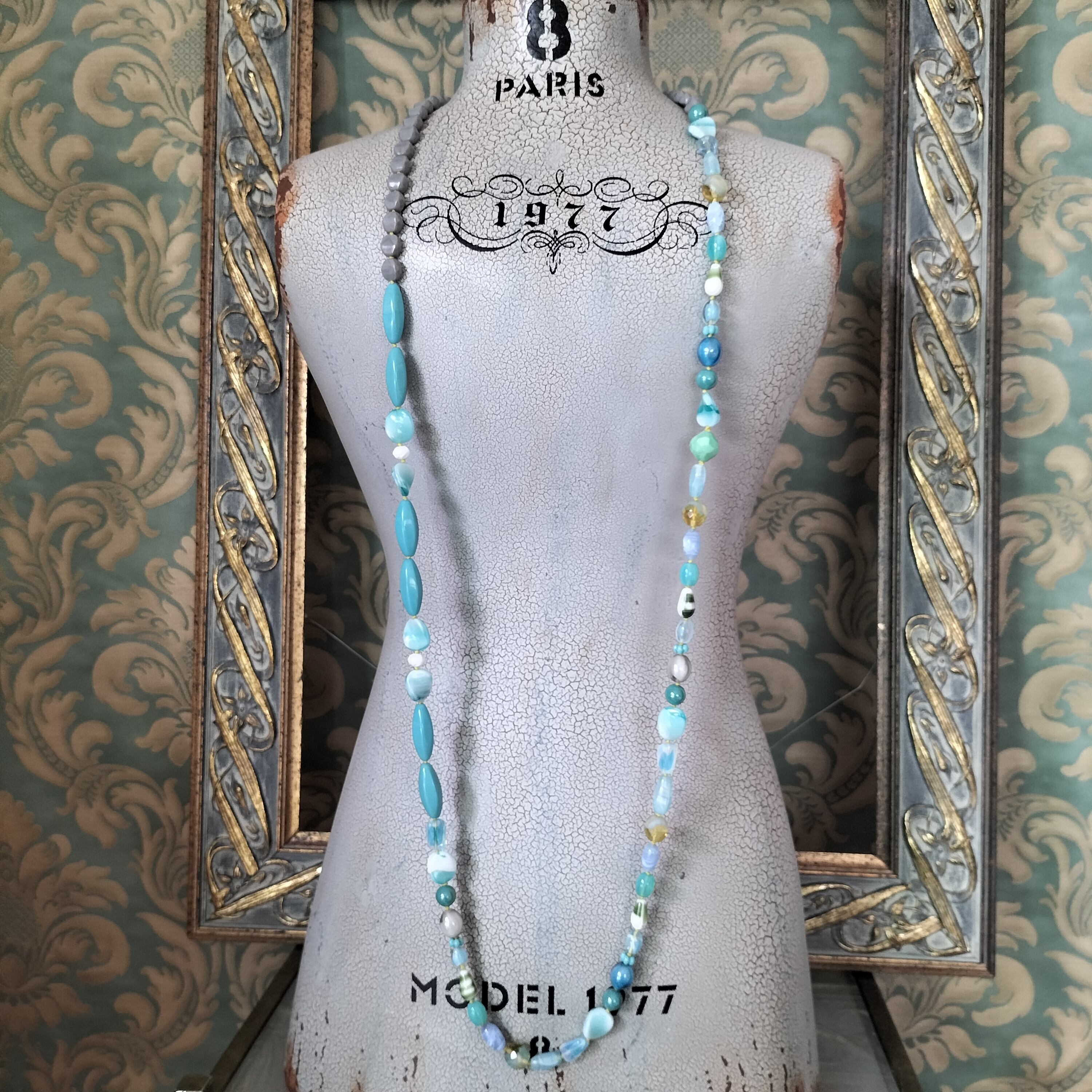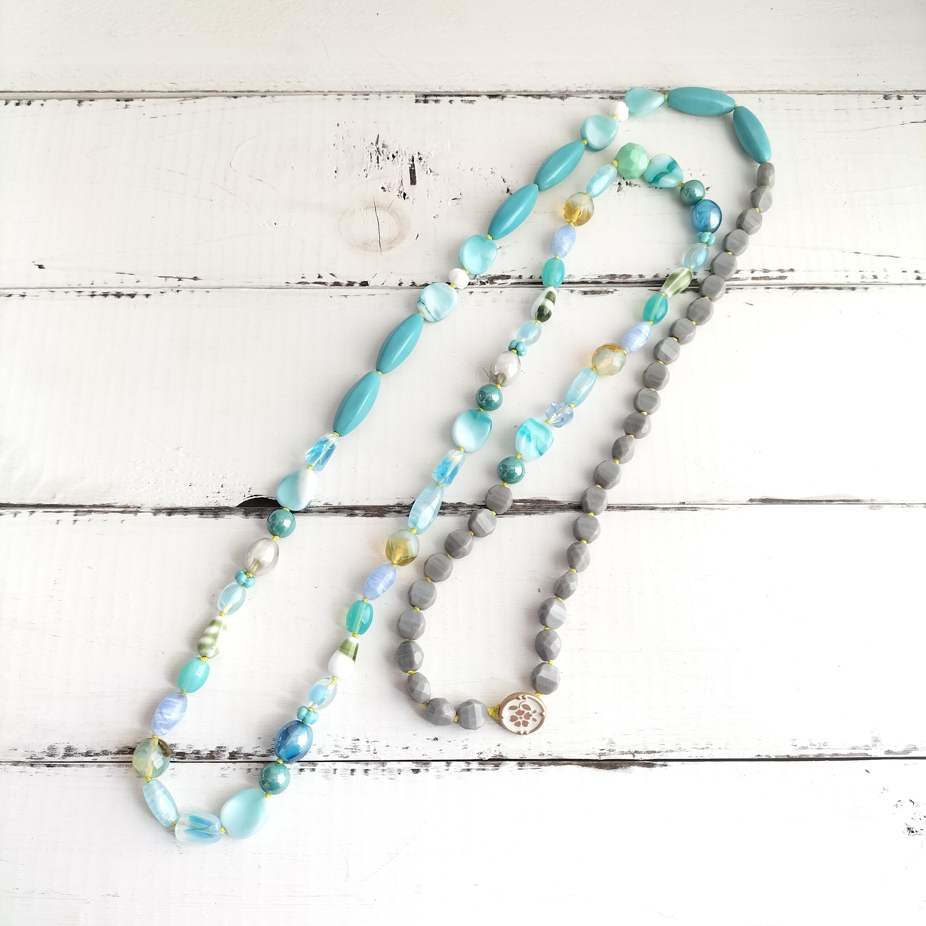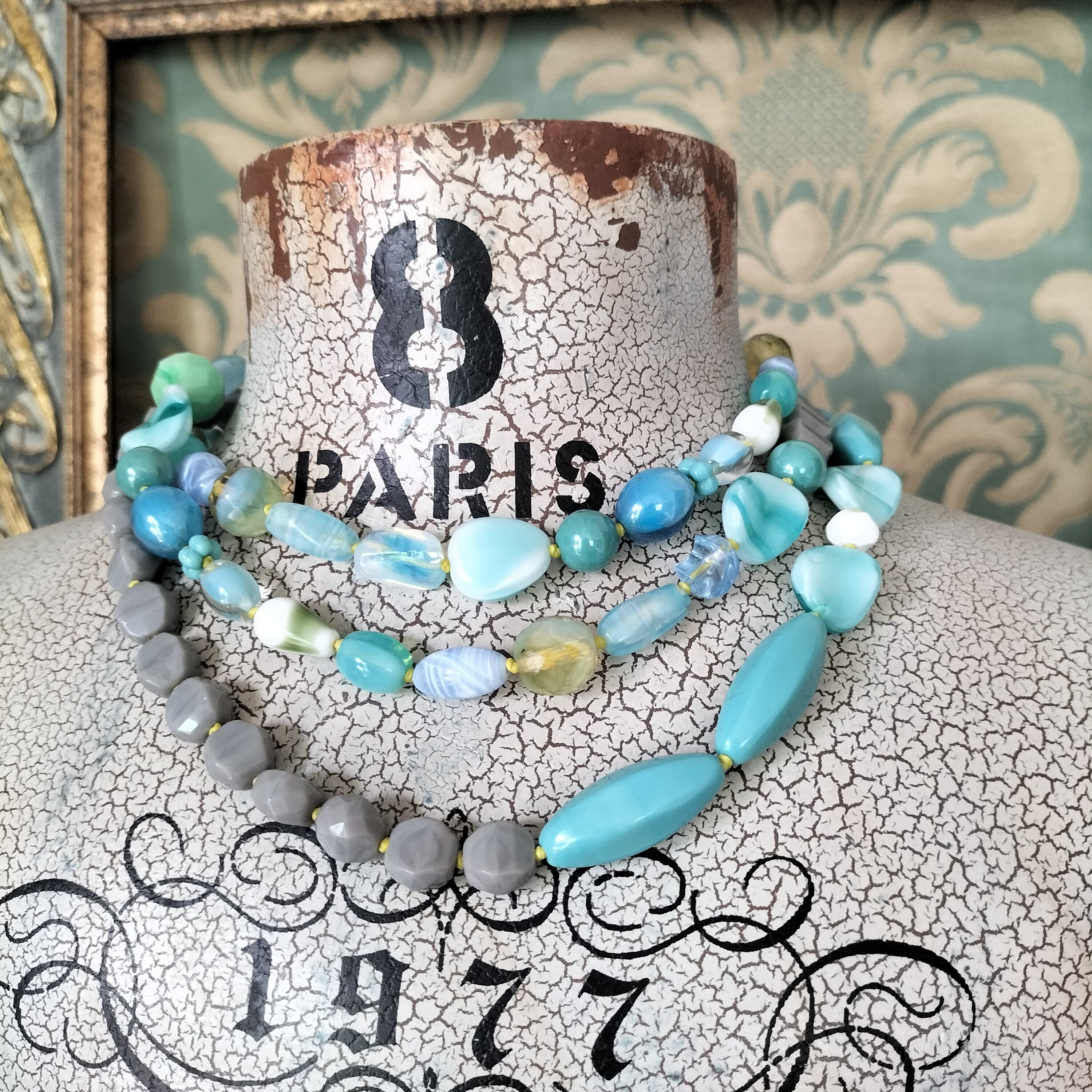希少なヴィンテージ&アンティークビーズ シックな大人グレーと夏空ブルーのバイカラー ロングネックレス 3連もOK♡一粒ずつ糸で結ぶオールノット技法 アレルギーでも安心♡ フランス買付 ギフト無料 数量限定 高級感あるオリジナル巾着付き☆母の日ギフト 誕生日プレゼント❣️